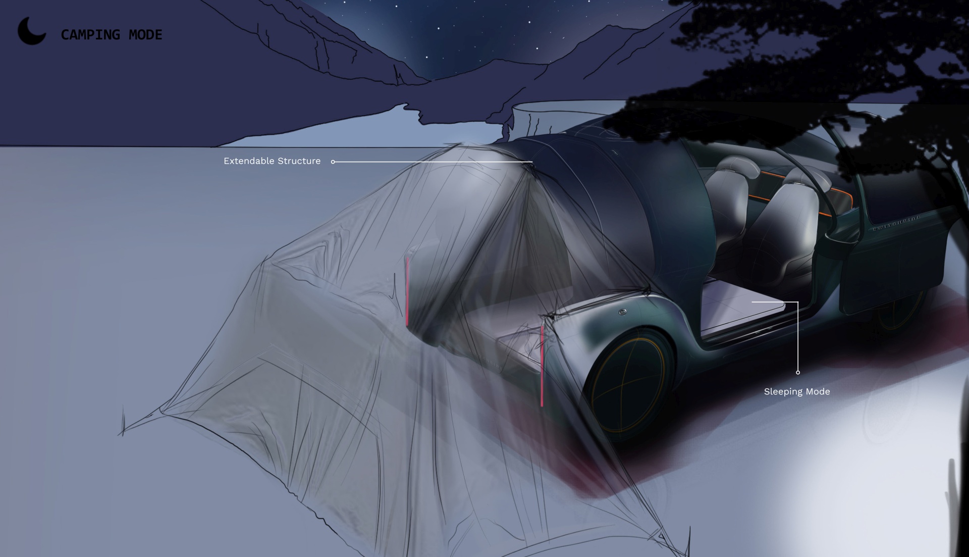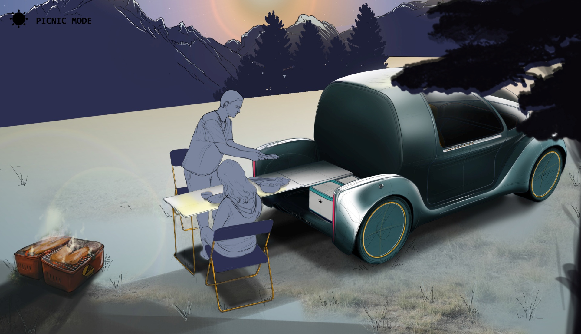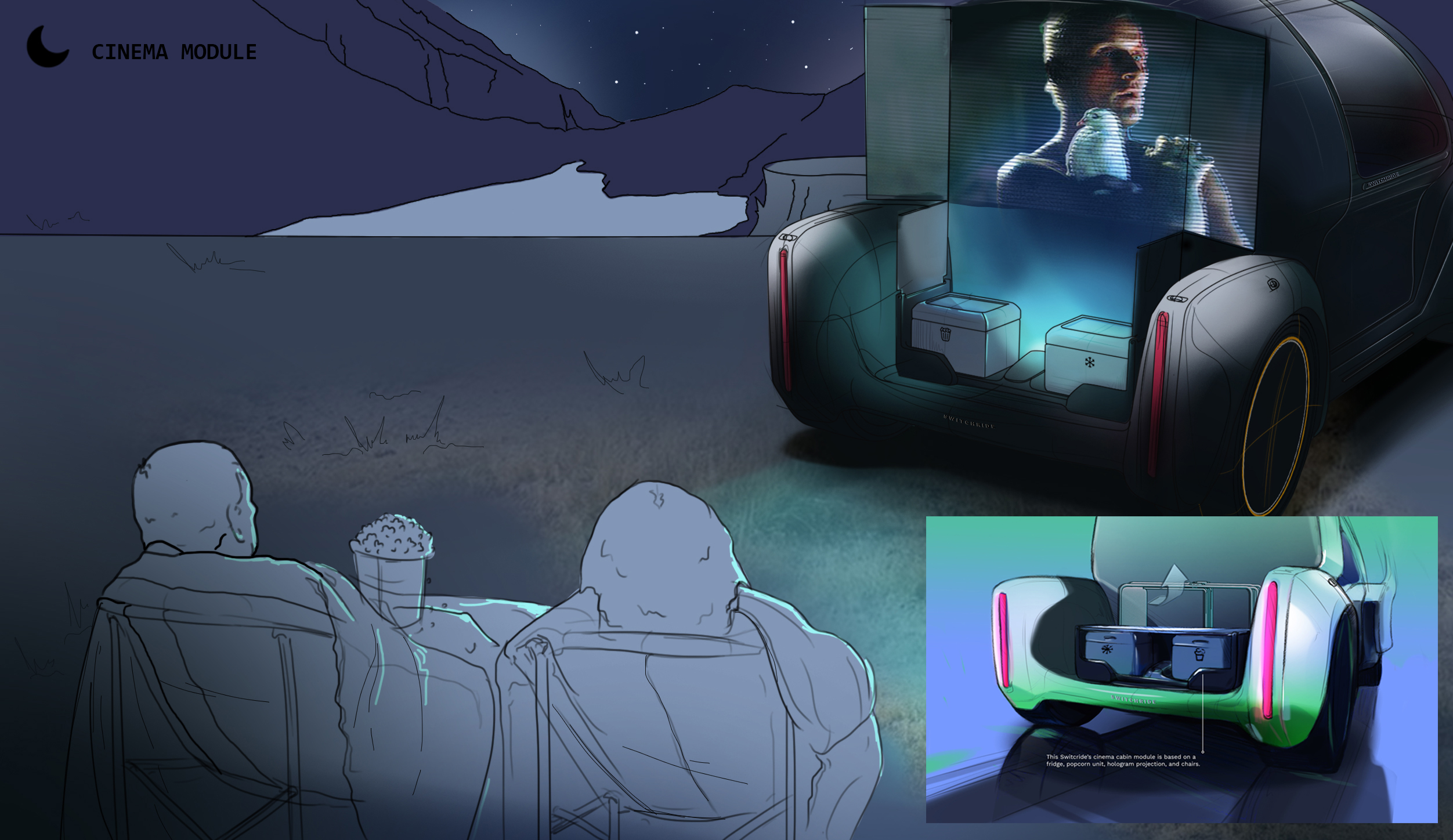 The project called ‘Switchride’ is set in 2040. The concept system is based on demand, electrically powered chassis that can take different switchable bodies depending on the intended use while I choose to focus on a specific field which is the actual need for entertainment. ‘Switchride’ is aiming to provide a system that offers for all users to help massive crowds to reach different needs by offering a whole new range of purpose-specific bodies of the vehicle, which the user can pick and book at any given time from the subscription services rather than personally owned ones. I tried to emphasize the concept of the camping, picnic module, and cinema module. The users can book the types of equipment and the service can attach them to the cabin easily depending on their needs and the next journey.
