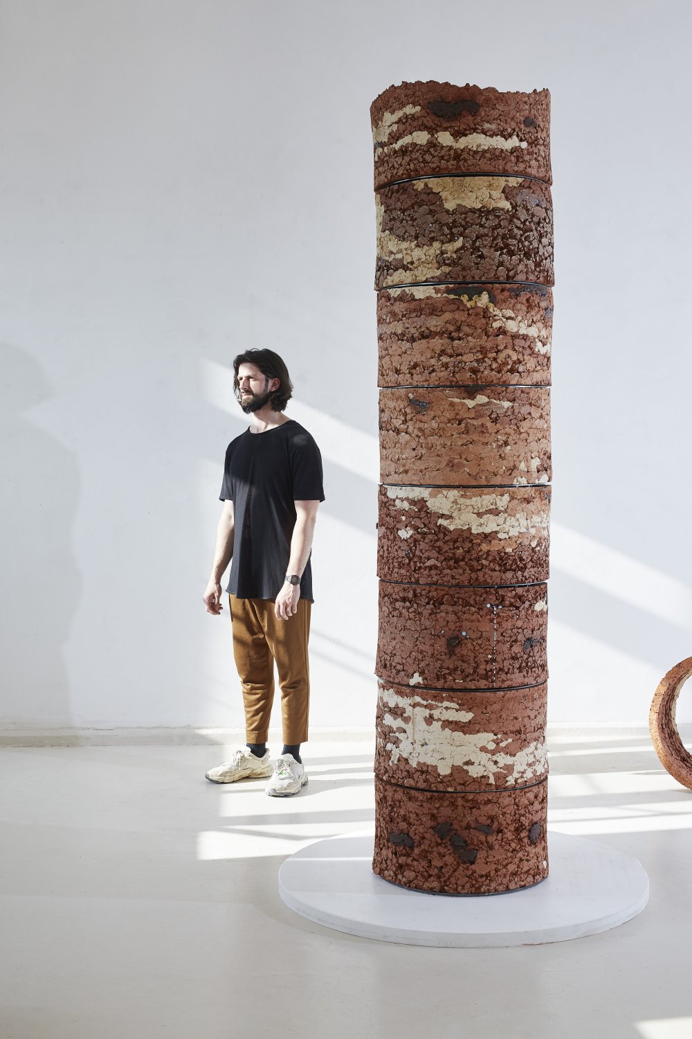 Výsledkom môjho výskumu je takmer 3-metrový monument inšpirovaný geologickými vrtmi; zhotovený z ílov pomocou dusania do formy.