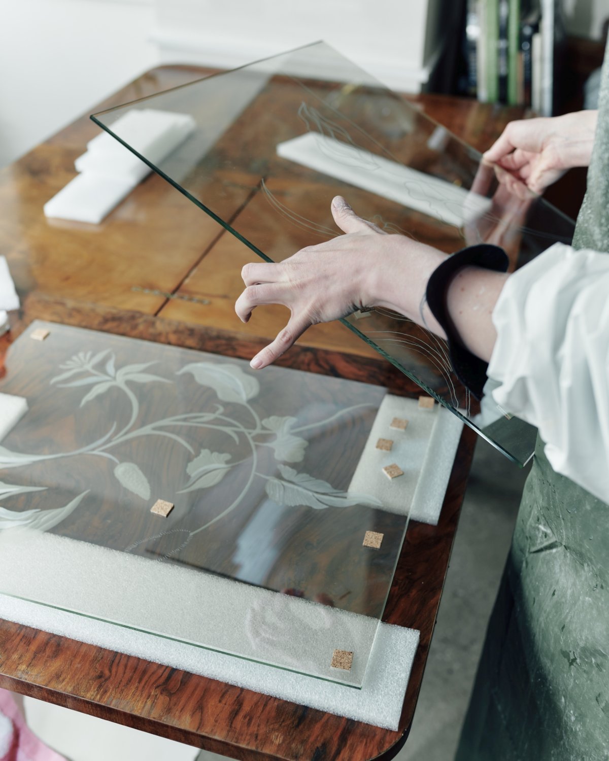 Záměrem této práce jež staví na staletých zkušenostech rytců, řemeslníků a historických dobových mobiliářích bylo vymanit rytinu z klasického použití, rozměrů, posunout ji do většího měřítka a propojit ji s moderním designem a současným životním stylem. Je to návrat k řemeslu art deca a raritním, unikátním kusům dokonale zpracovaného nábytku, ale i k manýristickým kabinetům kuriozit, které mají v rudolfínské Praze tradici. Skleněné tabule polopropustných zrcadel darovány firmou AGC.