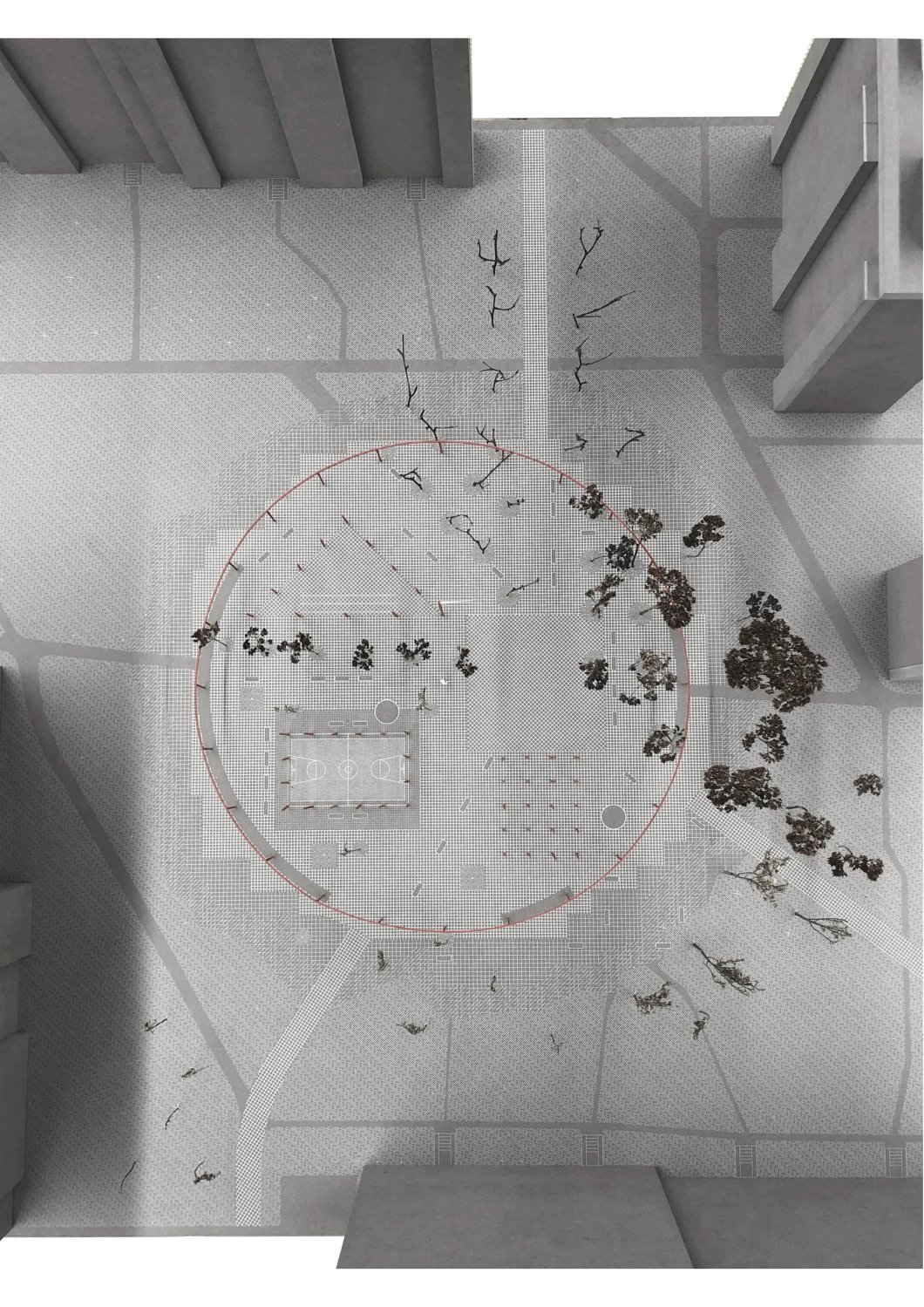 Práce je zaměřena na hledání koncepce veřejných prostranství na sídlišti, a to na pražském Jižním městě. Soustřeďuji volnočasové prvky a aktivity do jednoho místa - lokálního centra - romantického parku. Plynoucí prostor pomyslně ukotvuji kruhovou konstrukcí – altánem, kde základním prvkem je ocelový stožár a nosník. Upravuji měřítko prvků z malých drobků na adekvátní velikost tohoto místa. Altán funguje jako kostra pro další dění, pro další uchopení ze stran občanů, pro poskytnutí zázemí pro různé sousedské akce. Místo je navrženo tak, aby bylo flexibilní a mohlo se dále adaptovat dle budoucích potřeb.