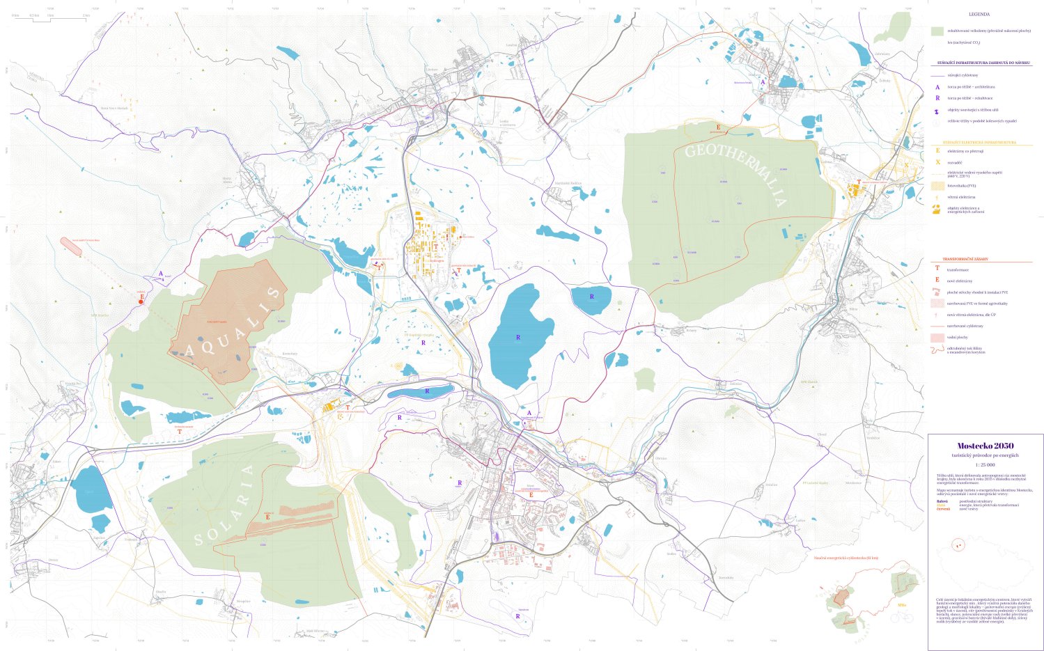 Diplomová práce zkoumá vztah energie, jejího získávání a hmotného, lidmi utvářeného světa. Definuje, co všechno energie je a jaké jsou její podoby. Zabývá se důvody a výzvami energetické transformace, které jako společnost čelíme. V praktické části mapuje Mostecko jako region, který projde rozsáhlou transformací jeho postfosilní struktury a hledá energetický a krajinný potenciál. Výstupem je mapa energetických vrstev, která si klade za cíl provést člověka jeho energetickými potřebami.