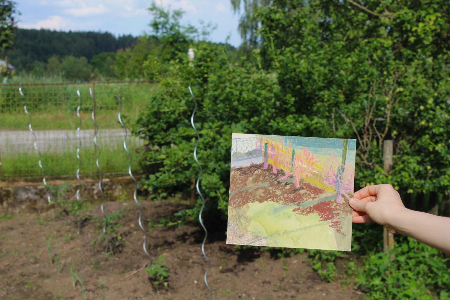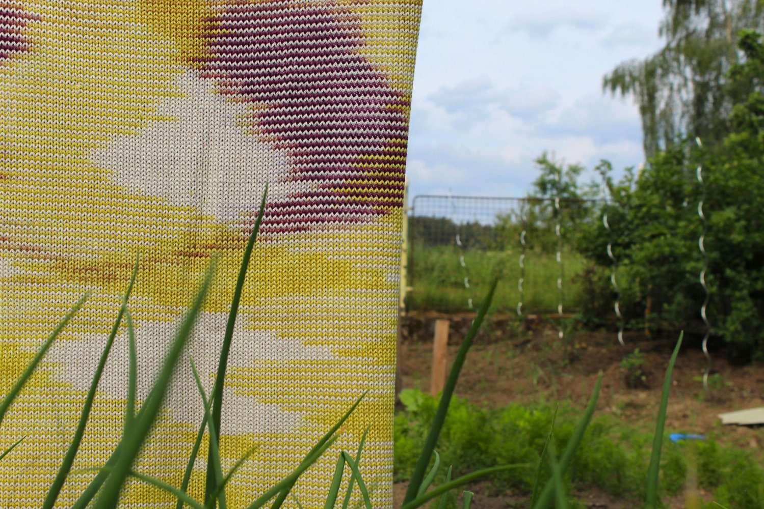 Zahrada jako bezpečný prostor. Místo, které člověk ovlivňuje, formuje a zvelebuje k obrazu svému, naproti tomu, jak zahrada ovlivňuje nazpět jej. Sledovala jsem bilanci zahrady, jako prostoru na hranici přírodního a uměle vytvořeného místa. Vůdčí inspirací se stala zahrada mojí babičky, která leží v pohraničí jižních Čech. Citlivým vhledem do uzavřeného prostranství zeleně, demonstruje blízký vztah člověka a jeho okolí. Výsledná práce se skládá ze série pletených dek, pastelových kreseb a audiozáznamu. Pletenina svým formátem přejímá bezpečný prostor zahrady a přenáší jej do interiéru. Spojnicí se stává pletený plot, který vymezuje zahradu od okolního prostoru, stejně jako deka rámuje a chrání tělo od okolních vlivů.