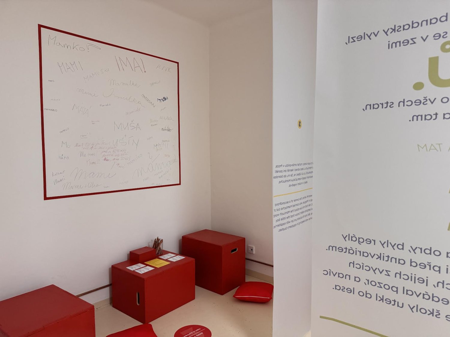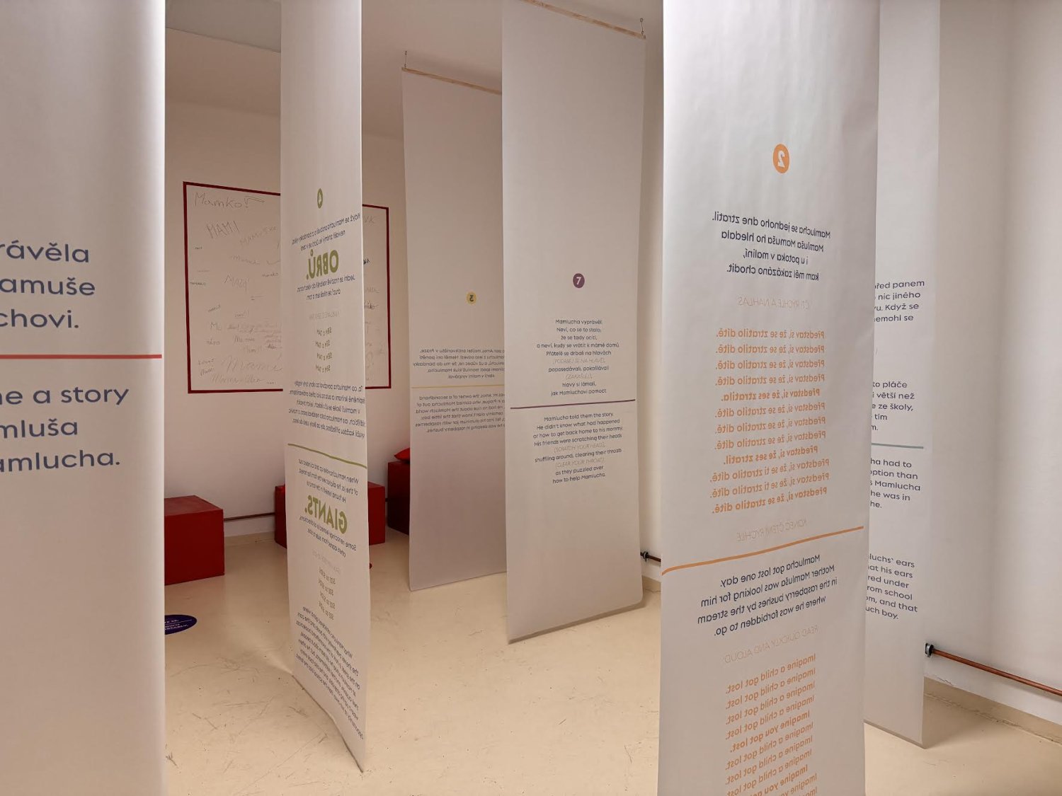 „Moje máma mi vyprávěla o mámě Mamluše Mamuše a o klukovi Mamluchovi.“ Instalace je hra a vy se stáváte její součástí – je to prostor pro imaginaci, asociace, možnost spolu vést dialog, poslouchat, vyprávět a vzpomínat.