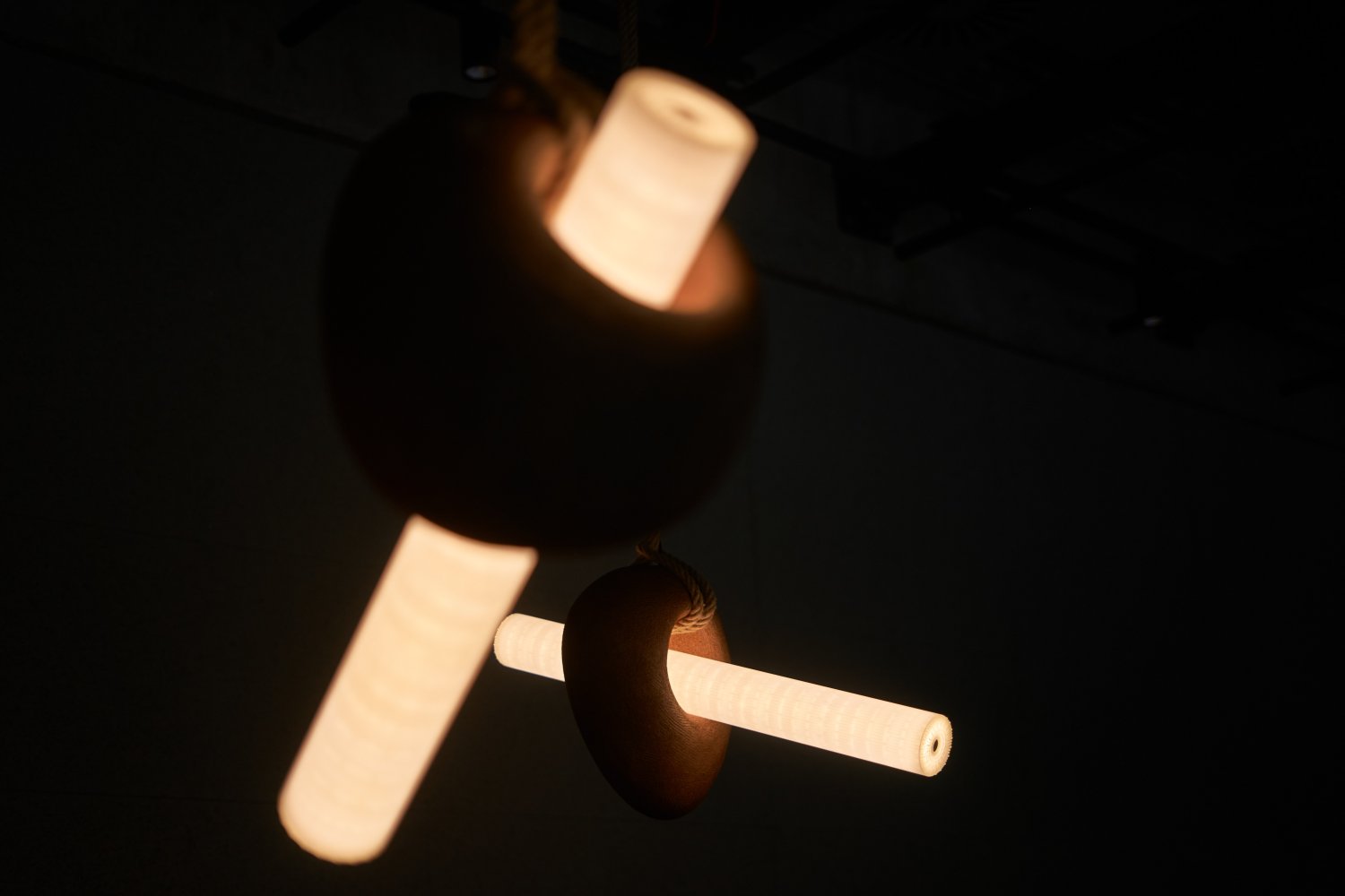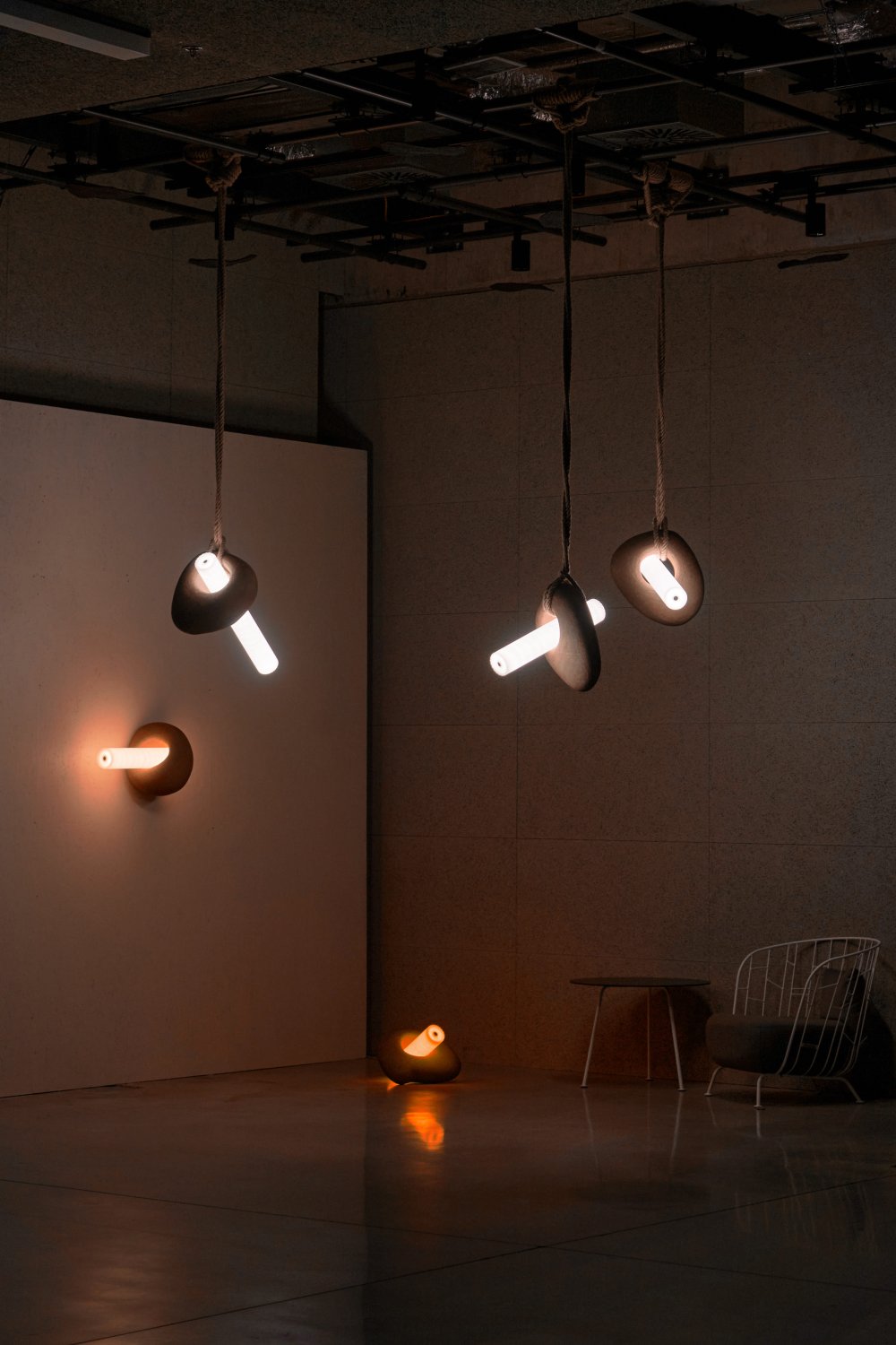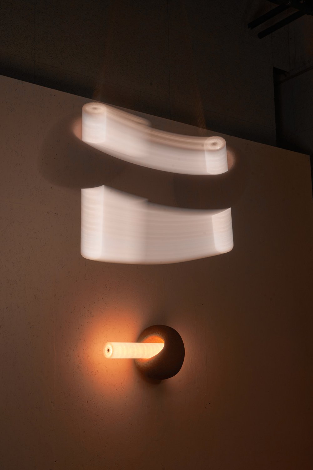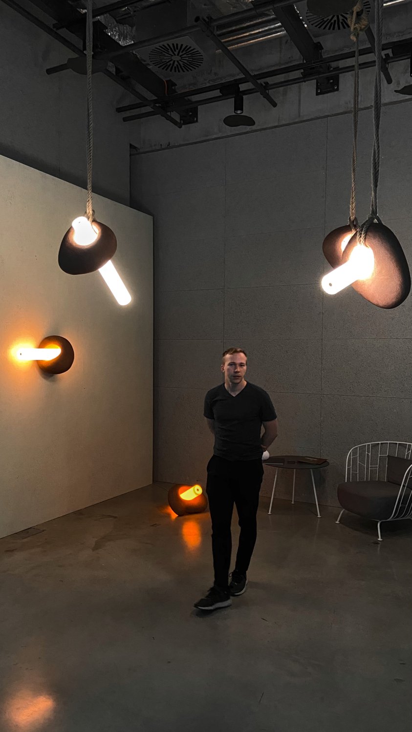 V návrhu kolekce se zabývám vlivem světla na cirkadiánní rytmus. Postupným snižováním pozice světla a změnou jeho barevnosti se připravujeme na kvalitnější spánek. Svítící válce jsou vsazeny do keramických objektů inspirovaných primitivními kamennými nástroji. Zaoblené tvary keramiky napomáhají vzniku gradientů světla a stínu, čímž zvýrazňují strukturu danou ruční výrobou. Výsledný návrh sleduje kontrast vizuálního projevu moderní technologie a řemeslné tvorby.