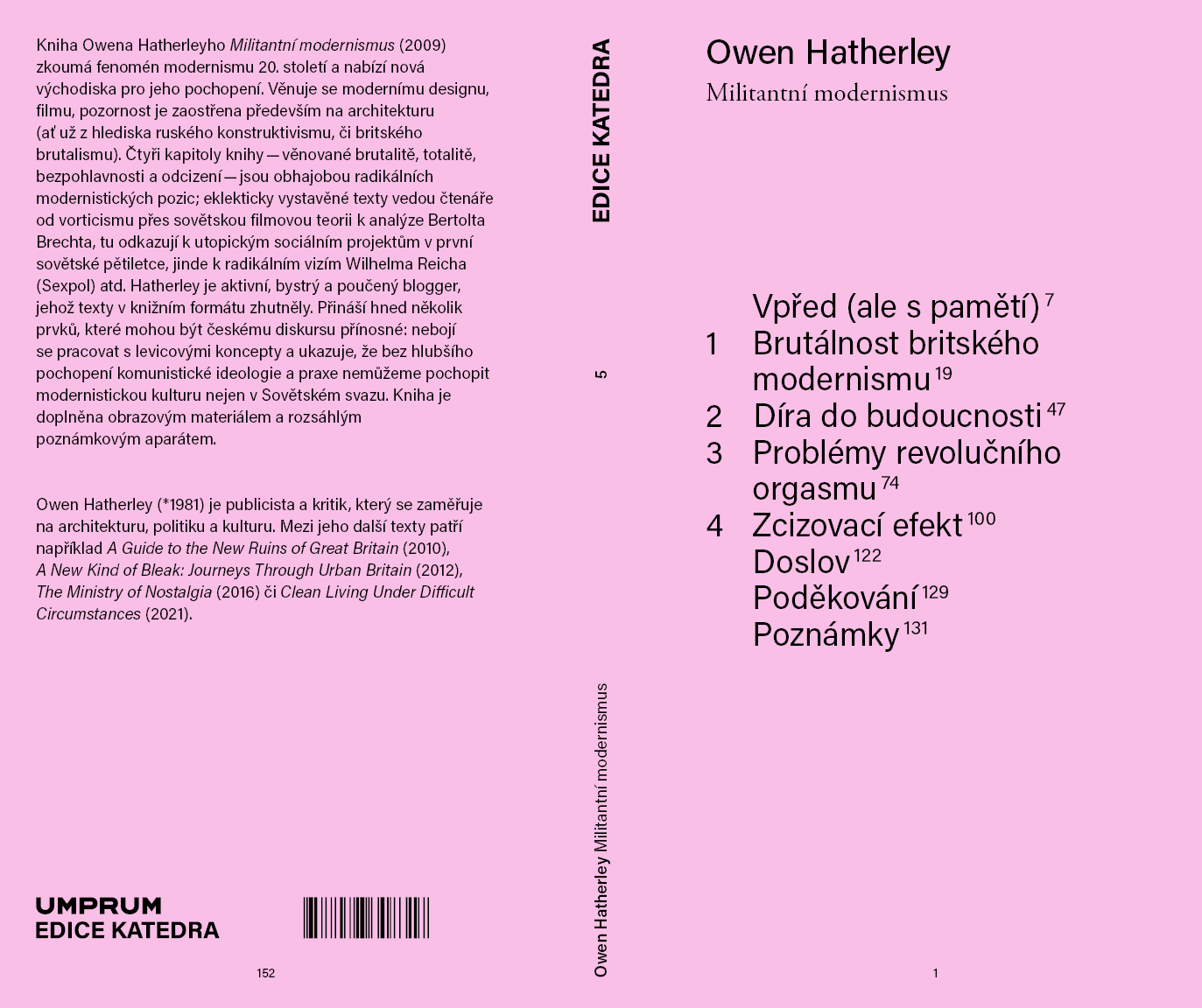 Kniha Owena Hatherleyho Militantní modernismus (2009) zkoumá fenomén modernismu 20. století a nabízí nová východiska pro jeho pochopení. Věnuje se modernímu designu, filmu, pozornost je zaostřena především na architekturu (ať už z hlediska ruského konstruktivismu, či britského brutalismu). Čtyři kapitoly knihy – věnované brutalitě, totalitě, bezpohlavnosti a odcizení – jsou obhajobou radikálních modernistických pozic; eklekticky vystavěné texty vedou čtenáře od vorticismu přes sovětskou filmovou teorii k analýze Bertolta Brechta, tu odkazují k utopickým sociálním projektům v první sovětské pětiletce, jinde k radikálním vizím Wilhelma Reicha (Sexpol) atd. Hatherley je aktivní, bystrý a poučený blogger, jehož texty v knižním formátu zhutněly. Přináší hned několik prvků, které mohou být českému diskursu přínosné: nebojí se pracovat s levicovými koncepty a ukazuje, že bez hlubšího pochopení komunistické ideologie a praxe nemůžeme pochopit modernistickou kulturu nejen v Sovětském svazu. Kniha je doplněna obrazovým materiálem a rozsáhlým poznámkovým aparátem.