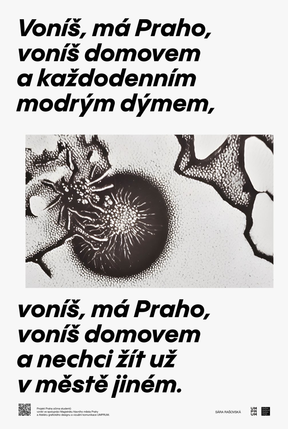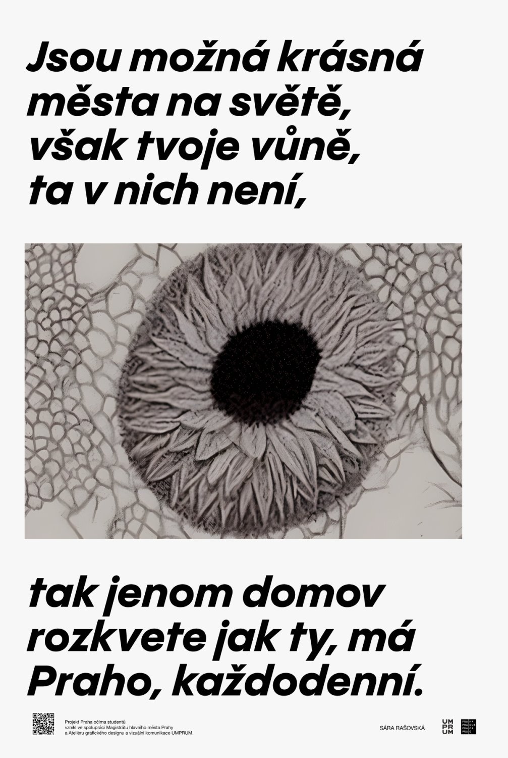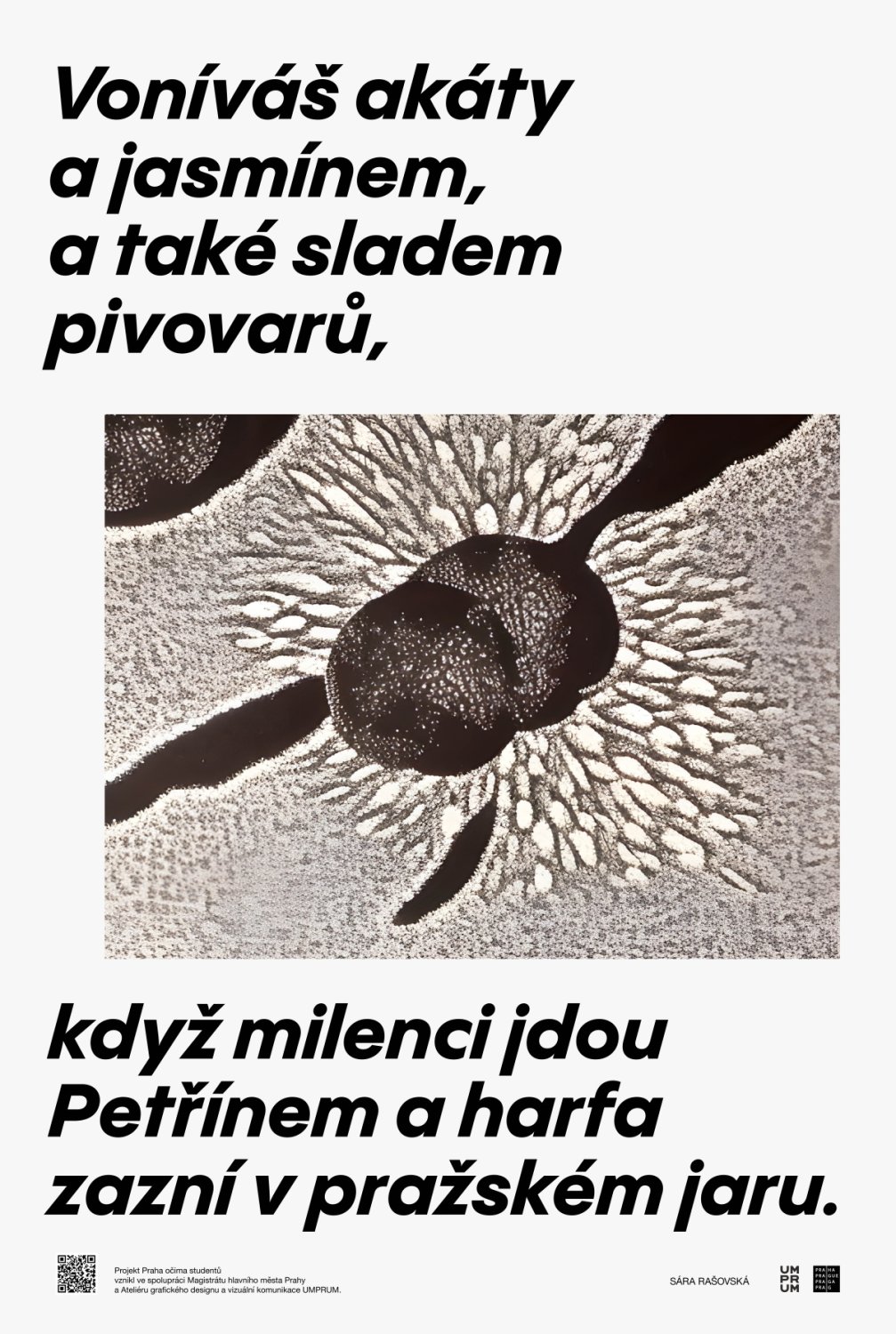 Pražanům představí svou autorskou grafiku například Sára Rašovská, která se inspirovala městskou přírodou a každodenními tématy, které ji obklopují. Ve své tvorbě experimentuje s kombinováním různých technik a koncepčních přístupů a tentokrát vycházela její interpretace městského prostředí z textu Písně o Praze Waldemara Matušky, jejímž autorem je Petr Rada.
