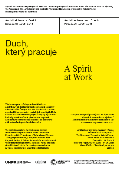 Nakolik může politika ovlivňovat architekturu a její vývoj? Tuto otázku si kladl tým odborníků z Katedry teorie a dějin umění Vysoké školy uměleckoprůmyslové v Praze. Výsledky jejich výzkumu lze vidět na výstavě Duch, který pracuje. Architektura a česká politika 1918-1945 v domě U Černé Matky Boží.