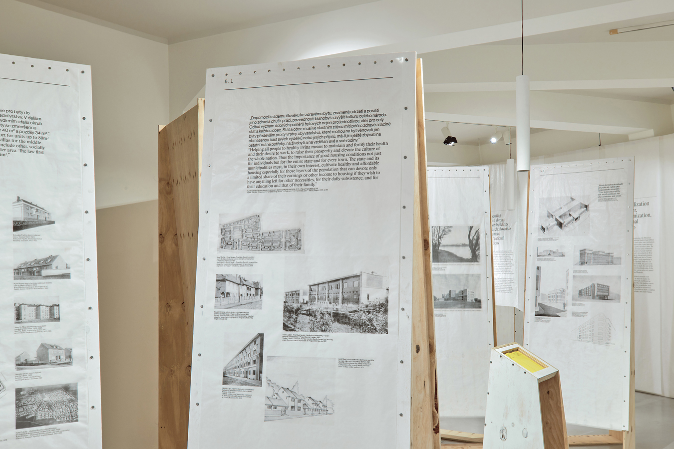 Výstava zahrnuje i výběr budov, jimiž stát a obce podporovaly dosažení sociálního smíru, zejména obytné stavby. Období Protektorátu se do expozice promítá zařazením nerealizovaných návrhů na přestavbu Prahy, které aplikovaly urbanistické postupy nacistického totalitního režimu.