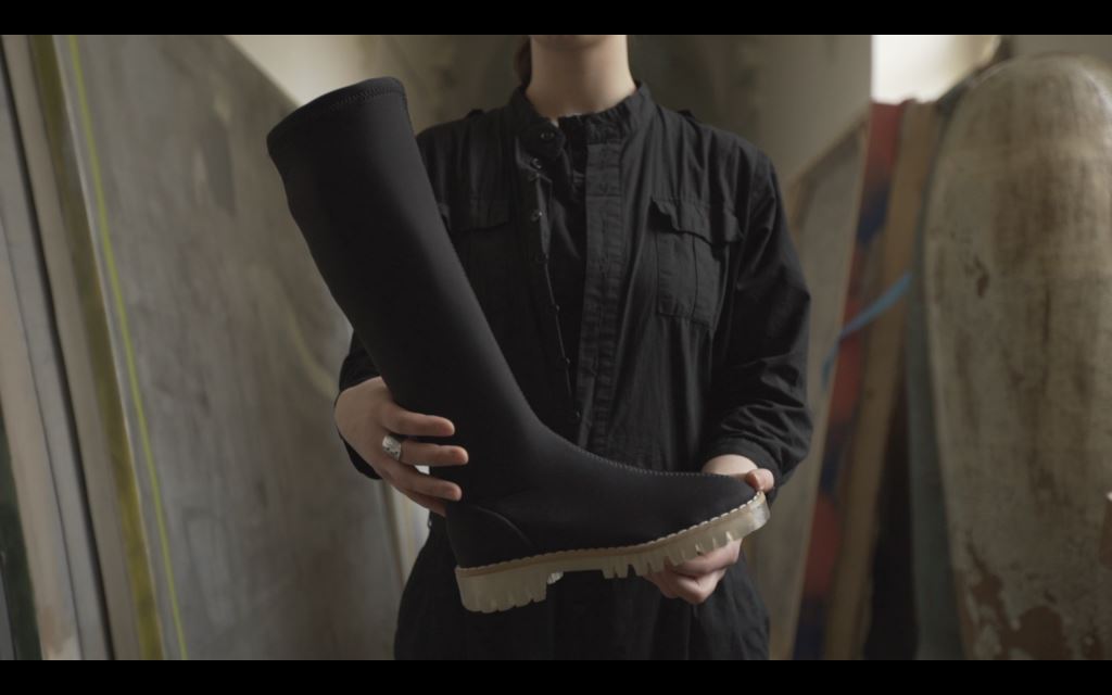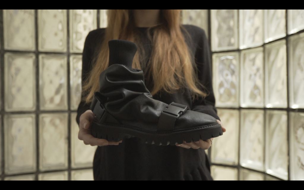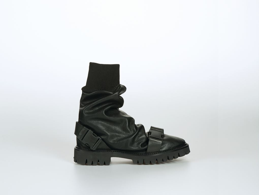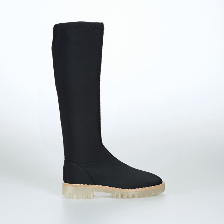Strečové černé kozačky bez zapínání stačí jen nazout a běžet. Hlavní myšlenkou obuvi je jednoduchost bez spojovacího materiálu a doladění vzhledu streetwear s příchutí budoucnosti. Kozačky se díky poddajnosti pružného materiálu velmi dobře přizpůsobí danému lýtku. Tvar a linie obuvi sleduje kvalitu textilie v kombinaci s transparentní podrážkou. Díky oproštění od zapínaní obuv působí čistě a nadčasově. Jediným zdobným prvkem se stává prošívání na středu a na zadním dílu obuvi.