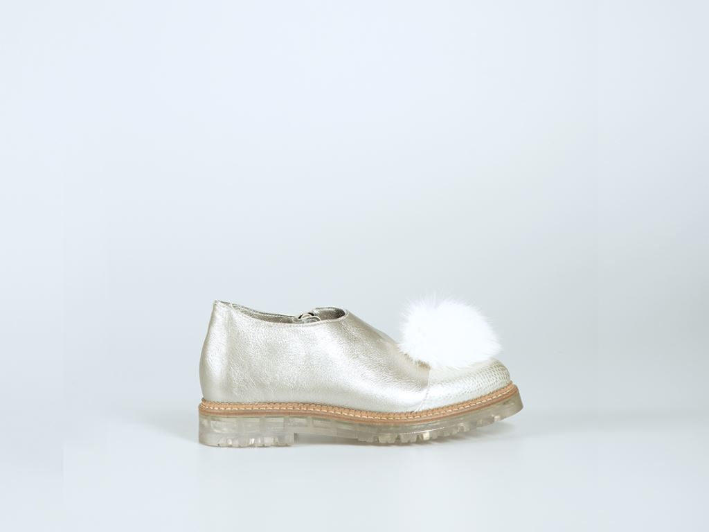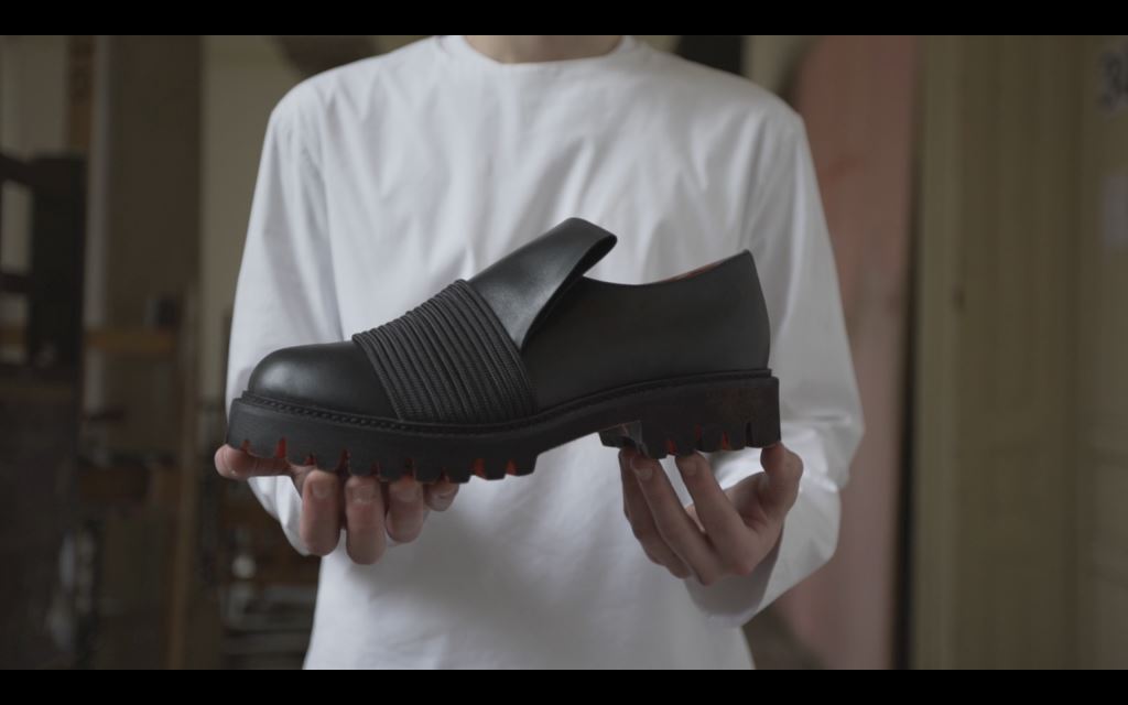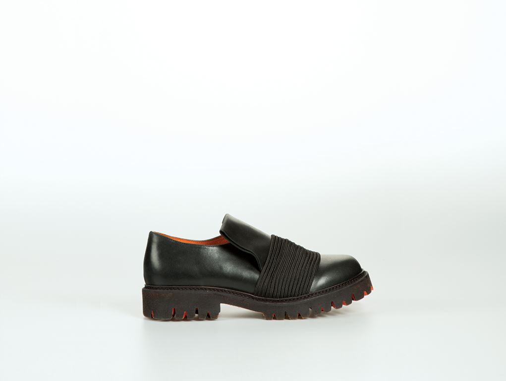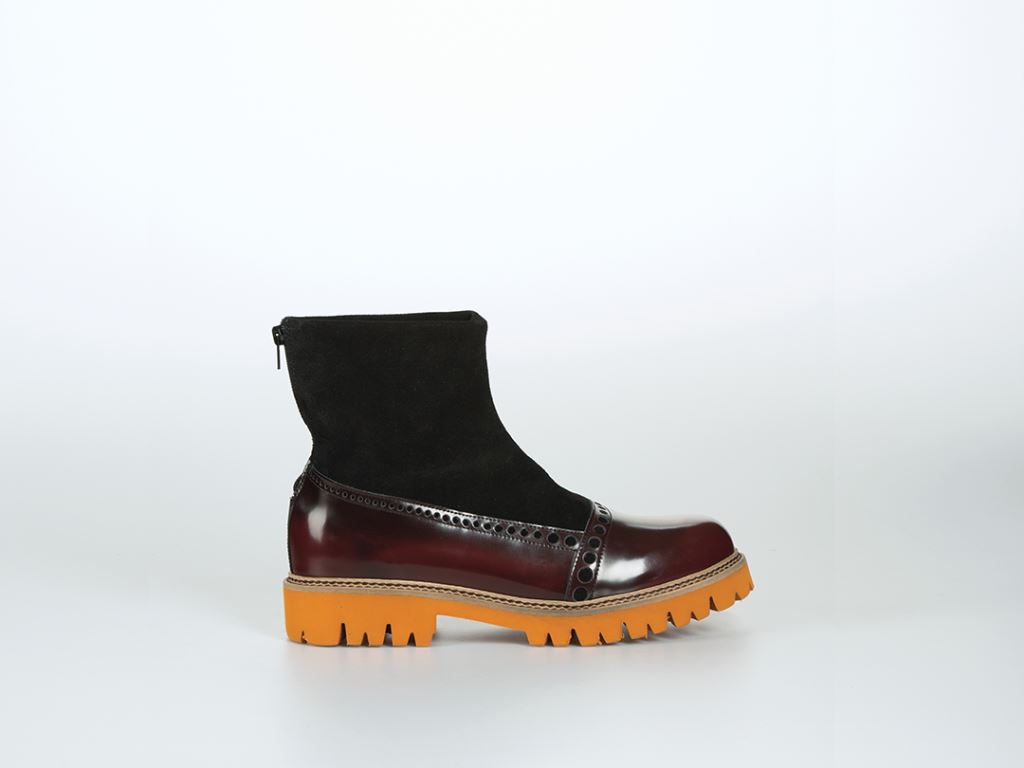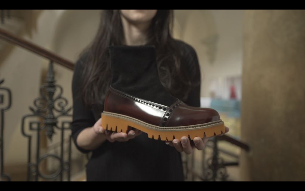 v novodobém pohledu 21. století. Obuv je nadčasová a současná zároveň. Tato myšlenka je vyjádřena především kontrastem mezi leštěnou částí s asymetrickým perforem, který zastává klasický styl boty, a barevně kontrastní podešví, která evokuje moderní obuv.