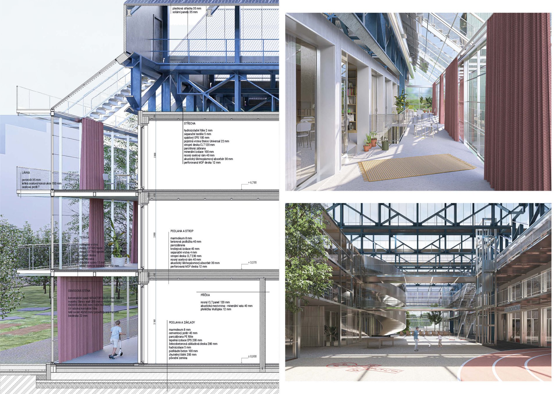 Porota soutěže projekt hodnotila následně: „Diplomová práce představuje komplexní návrh, který promýšlí školu jako otevřenou instituci a přirozené centrum městské komunity. Autorka reaguje na aktuální výzvy vzdělávání, udržitelnost, možnost transformace budovy na novou funkci, ale primárně se pokouší, aby architektura byla aktivním nástrojem pro rozvoj společenských vazeb. Silnou stránkou práce je promyšlená koncepční úroveň a schopnost přenést teoretické principy do konkrétního urbanistického i architektonického řešení. Návrh přesvědčivě pracuje s myšlenkou prostupné, otevřené školy propojené s životem a městem. Nabízí kvalitní systém klastrových prostorů pro vzdělávání i komunitní aktivity. Architektura působí technicky i esteticky přesvědčivě, má jasnou konstrukční logiku a vizuální prezentaci. Některé části návrhu by mohly být dále rozvinuty směrem k větší jednoduchosti a provozní přehlednosti, aby se neztrácela přirozená čitelnost prostorů pro jejich uživatele a jich vzájemná možnost dělitelnosti. Porota diskutovala, zda vysoká míra otevřenosti školy vůči veřejnosti nezpochybňuje určitou míru intimity a bezpečí, kterou školní prostředí vyžaduje. Celkově práce představuje velmi vyzrálý, inspirativní a společensky relevantní projekt, který spojuje architektonickou kvalitu s odpovědností vůči prostředí i komunitě. Výsledkem je přesvědčivá syntéza ideového záměru a architektonického výrazu. V diplomové práci je patrný teoretický přesah. Projekt intuitivně dokáže rozvíjet principy Hermana Hertzbergera, zejména v pochopení školy jako otevřeného a veřejného prostoru, jenž přirozeně vstupuje do struktury města. Prostupnost, vrstvení a jemná hierarchie prostorů vytvářejí prostředí podporující každodenní setkávání i sdílení, a tím naplňují ideu školy jako živého organismu komunity. Za svou hloubku, společenský přesah a profesionální zpracování byla práce oceněna 2. místem, přičemž porota ocenila především její vizi školy jako otevřeného, adaptabilního a živého městského organismu.“