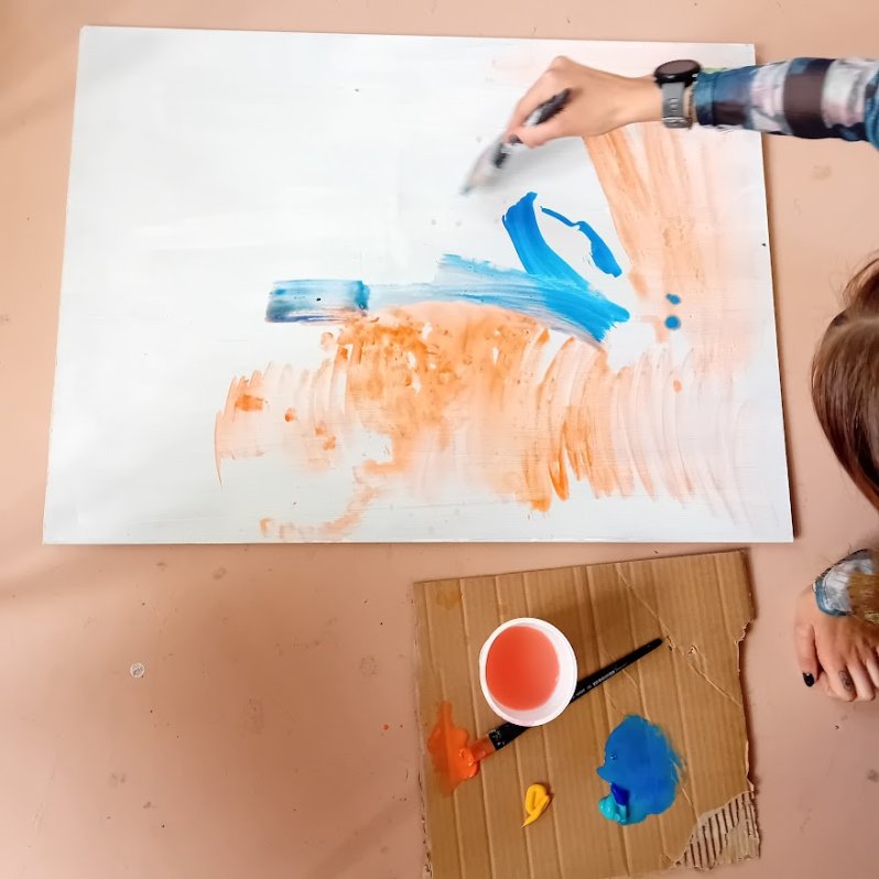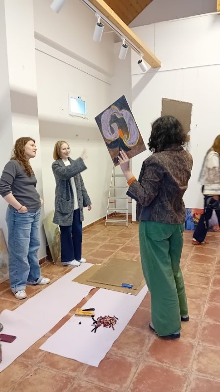 “Během workshopu jsme vytvářeli mnohovrstevnaté obrazy převážně akrylovými barvami na našepsovaných deskách. Začali jsme s tenčími, zářivě barevnými vrstvami, které jsme sušili fénem, abychom mohli ihned nanést více barvy. Tímto způsobem se dialog mezi předchozími a novějšími vrstvami rozvíjel prostřednictvím juxtapozice, čímž vznikaly nové skvrny a barevná pole. Dalším krokem bylo obkreslení nově vzniklých tvarů uhlem. Poté jsme v rámci cvičení kombinujícího pozorování a následování představivosti zkoumali, jaké obrazy se z obkreslených siluet vynořují, a malovali jsme je, tentokrát nanášejíc silnější vrstvu barvy, přičemž části předchozích vrstev jsme ponechali viditelné. Ve všech fázích, včetně té poslední, nás Štěpán vedl k přidávání a ubírání barvy, experimentování s materiály, jako jsou například plastové tašky, abychom vytvořili texturu, což je prvek, který se v umělcově tvorbě často vyskytuje.