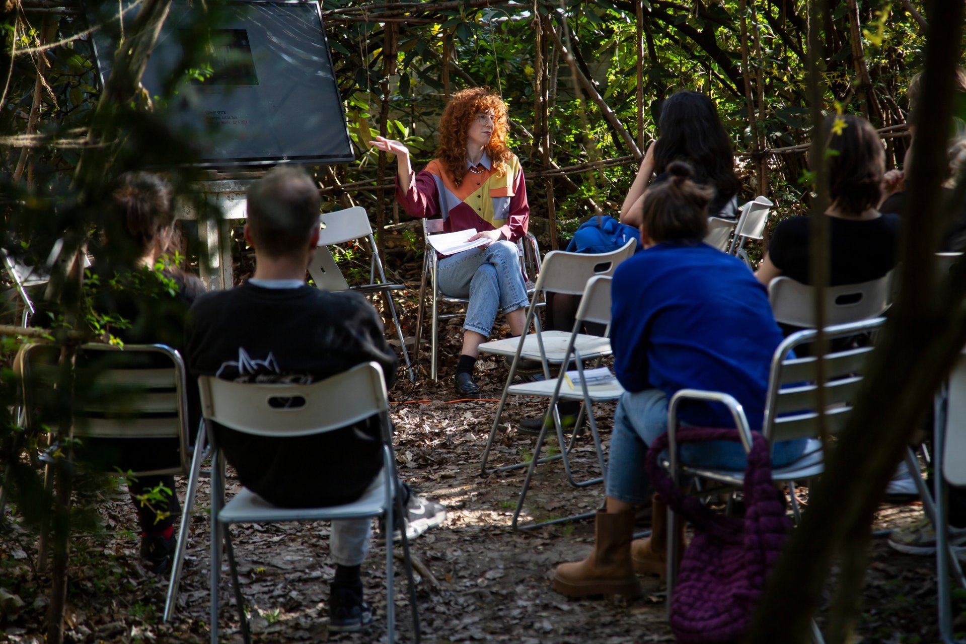 Seita ve své přednášce představila mezioborovou praxi na pomezí performance, experimentální pedagogiky, queer ekologie a vícedruhových spoluprací. Mluvila o projektech, které propojují tělesnost, feminismus, jazyk a péči – od tajného zahradnického spolku přes kukuřici jako alternativu k tradičním představám reprodukce až po kompost jako materiál queer učení napříč generacemi.