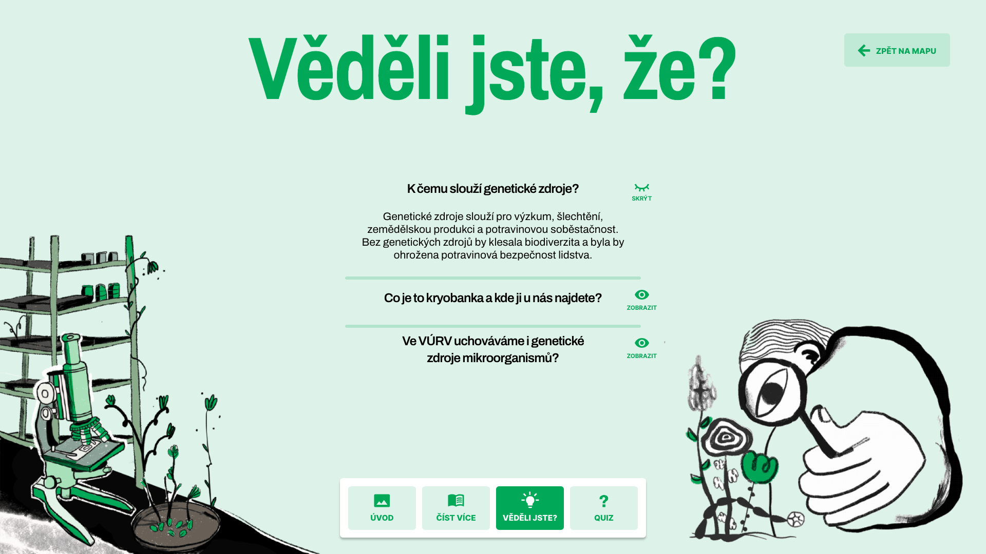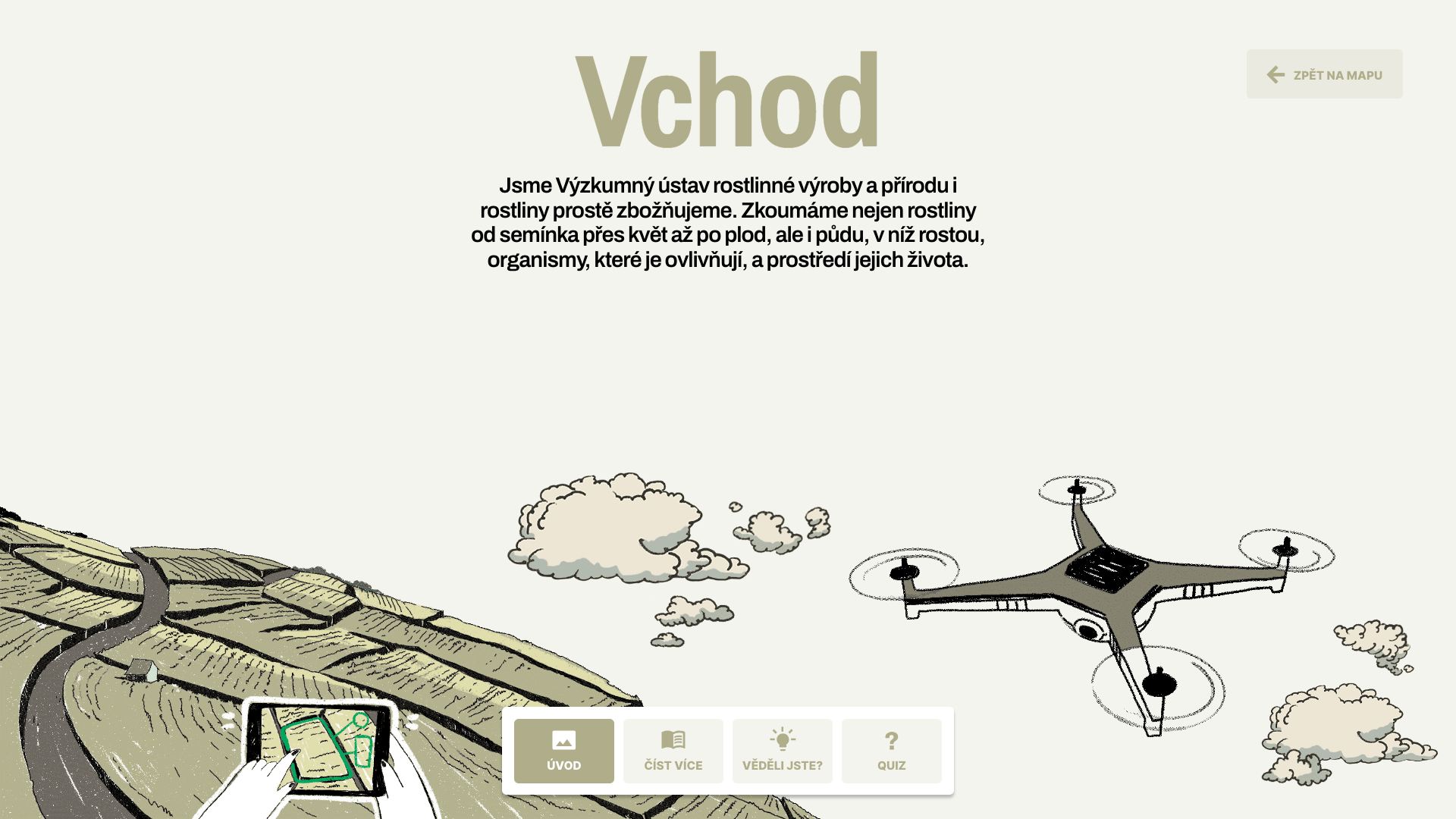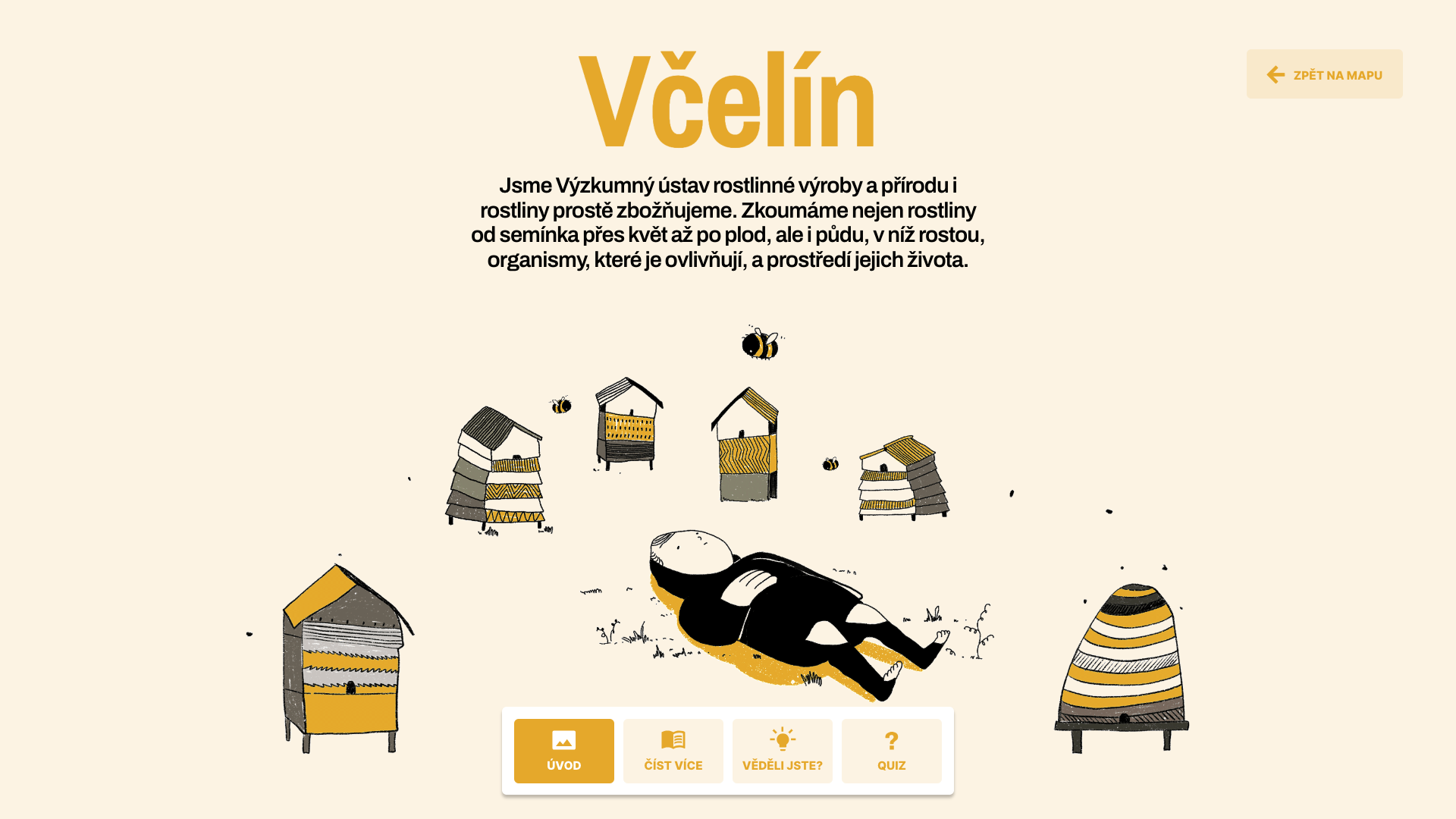 V poutavé animaci lze jednotlivé části VURV - pokusnou zahrádku, genovou banku či třeba včelín, rozkliknout a v jednoduché prezentaci se seznámit s její funkcí a významem pro ústav. K základním informacím o jednotlivých stanovištích jsou připojeny zajímavosti týkající se například zemědělského výzkumu nebo konzervace genofondu rostlin. Prezentaci každé z částí uzavírá hravý kvíz, v němž si mohou děti otestovat svoje znalosti.