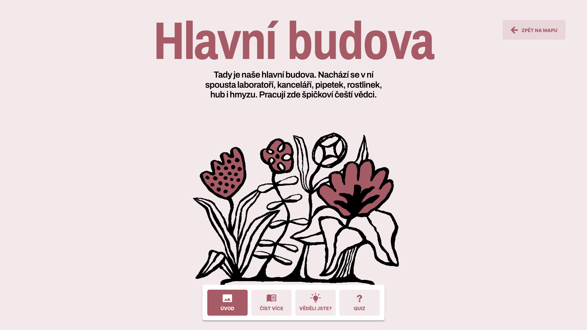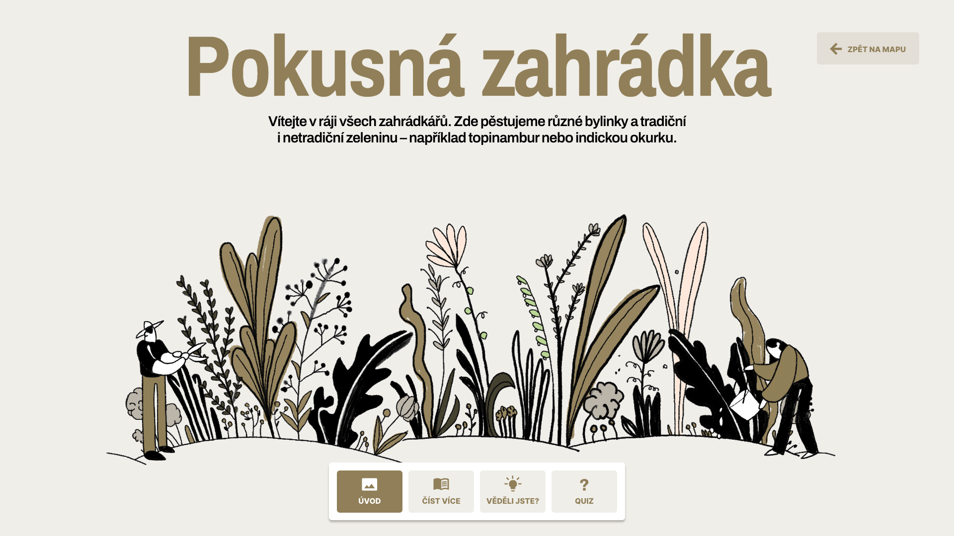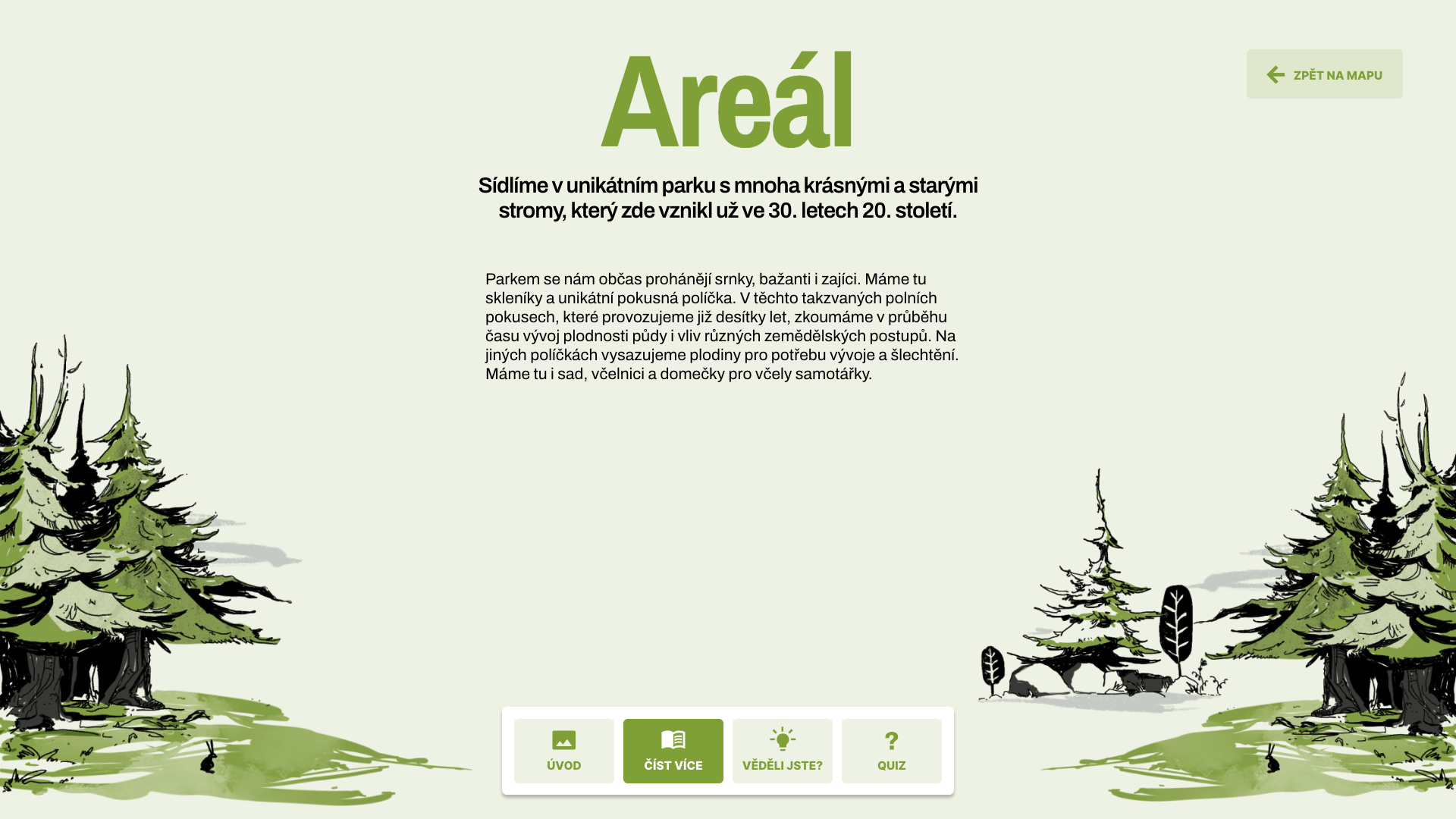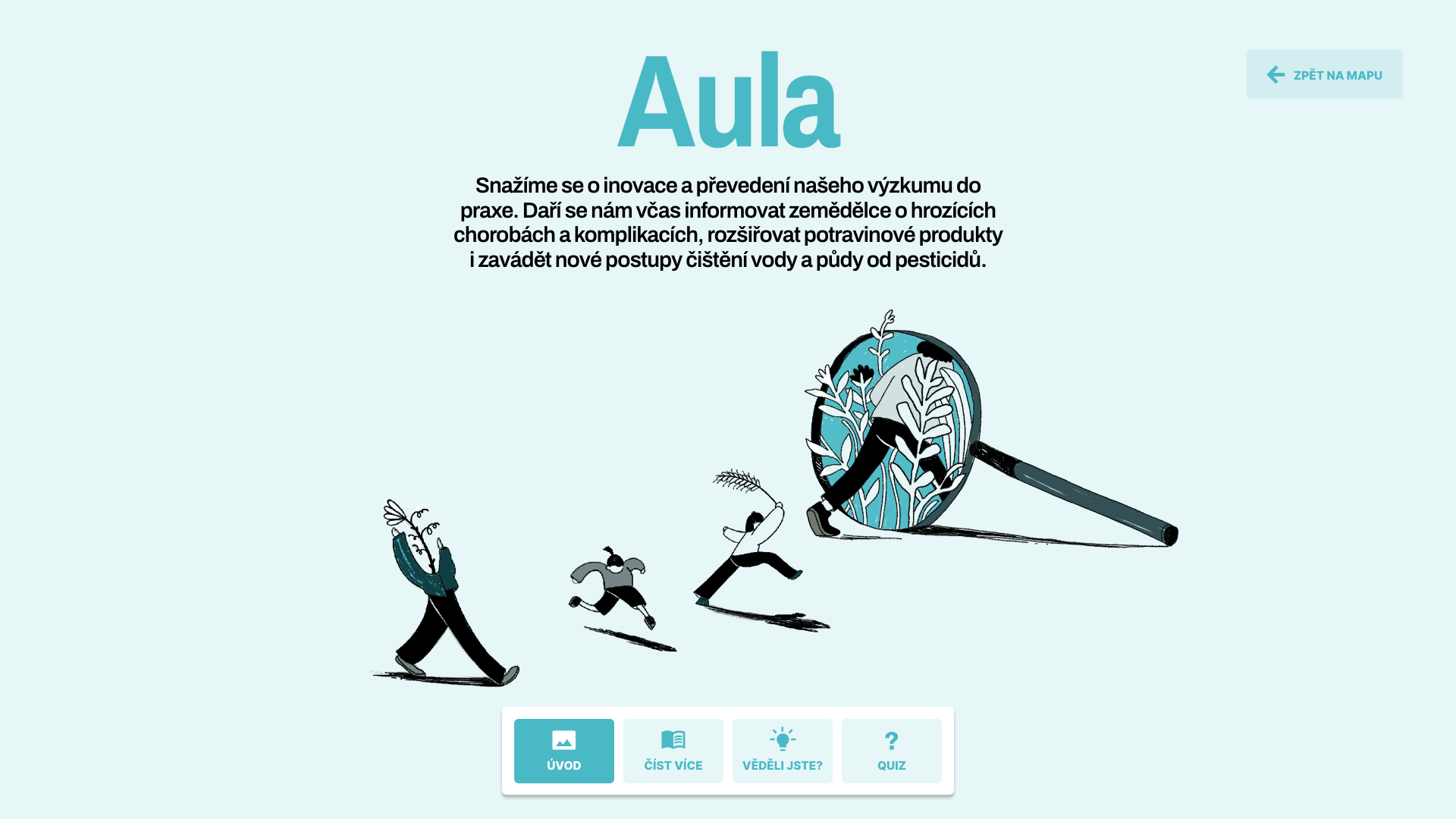 V poutavé animaci lze jednotlivé části VURV - pokusnou zahrádku, genovou banku či třeba včelín, rozkliknout a v jednoduché prezentaci se seznámit s její funkcí a významem pro ústav. K základním informacím o jednotlivých stanovištích jsou připojeny zajímavosti týkající se například zemědělského výzkumu nebo konzervace genofondu rostlin. Prezentaci každé z částí uzavírá hravý kvíz, v němž si mohou děti otestovat svoje znalosti.