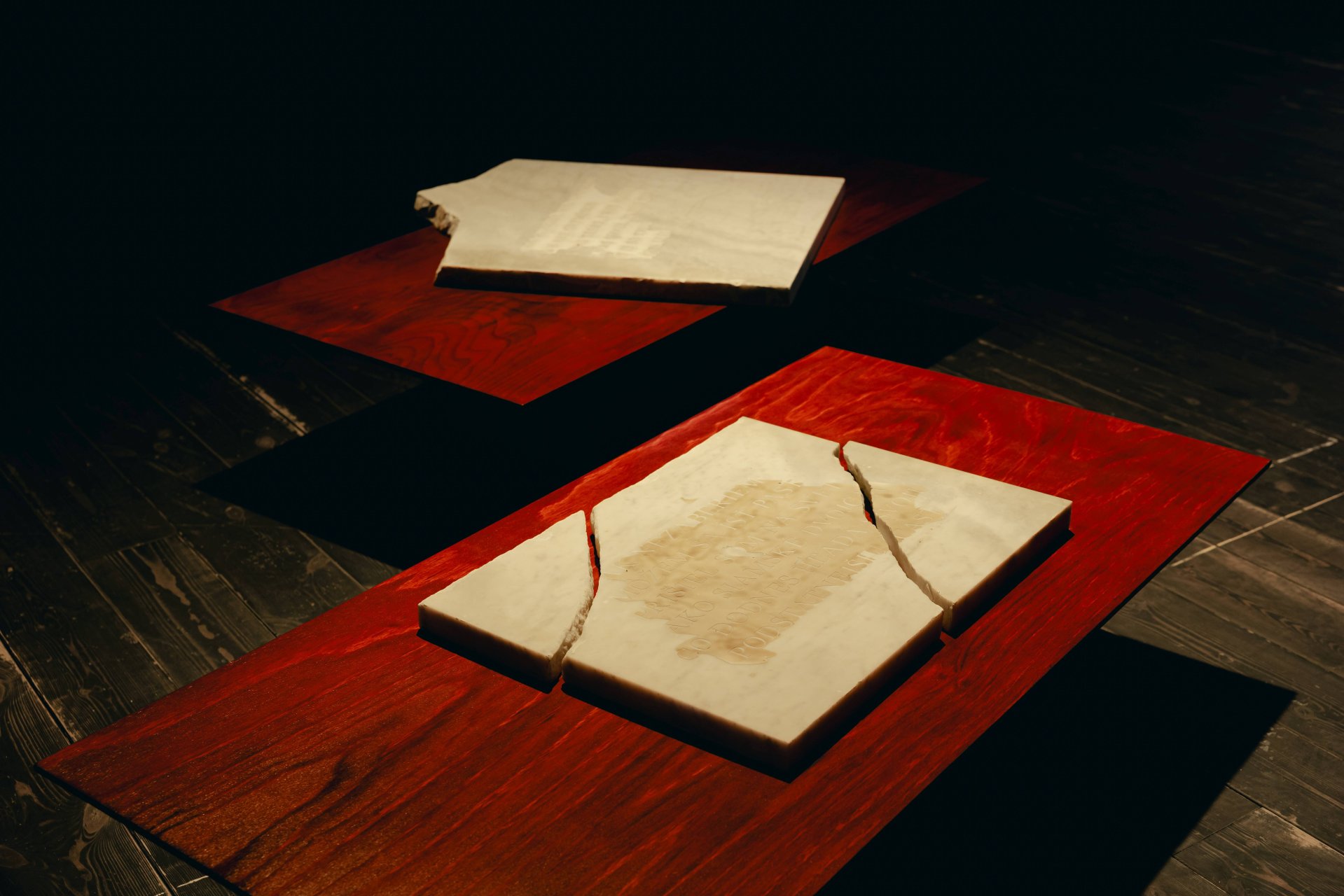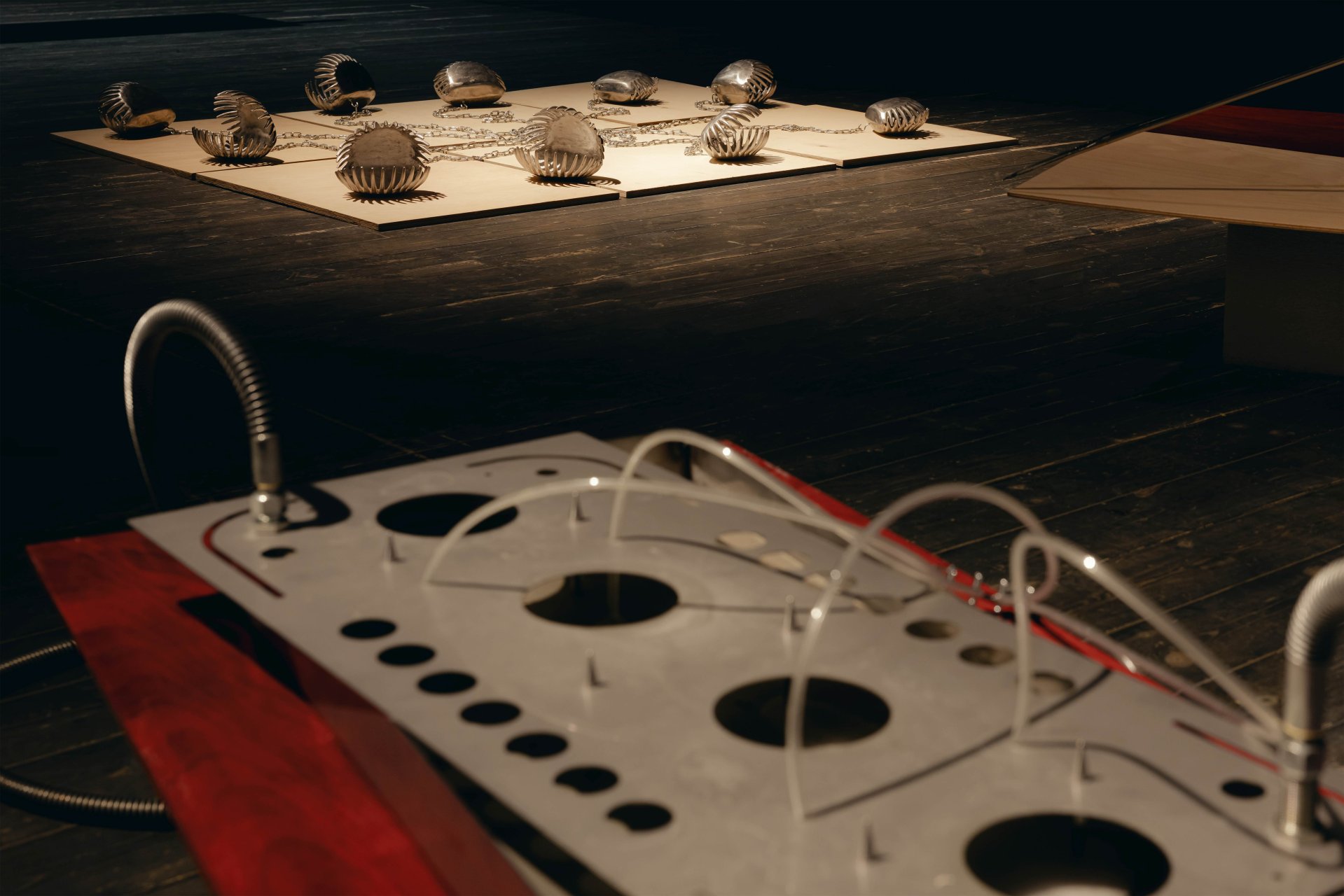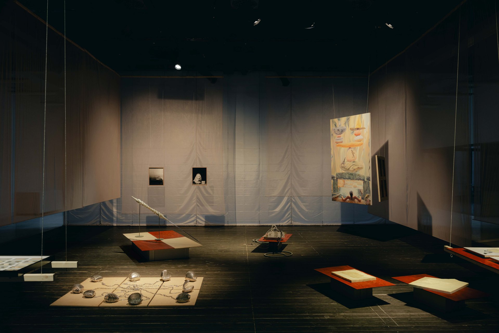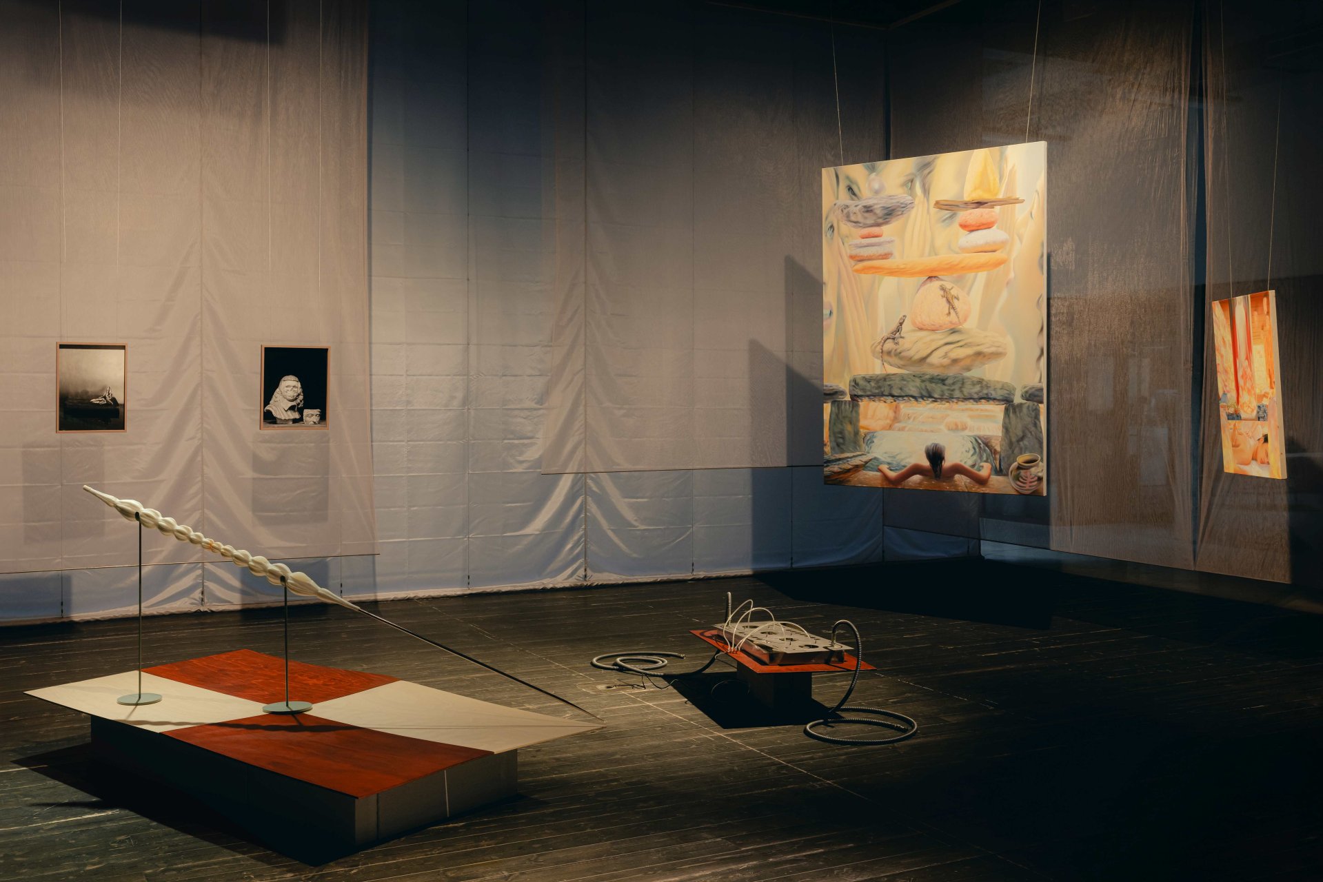 Poslání výstavy a samotná díla podtrhuje instalace studujících Ateliéru architektury II UMPRUM Adama Rýznara a Sofie Gjuričové. Expozici ohraničují poluprostupnou a prosvítající stěnou z tylové látky starorůžové barvy navozující pocit iluzorního bezpečí.