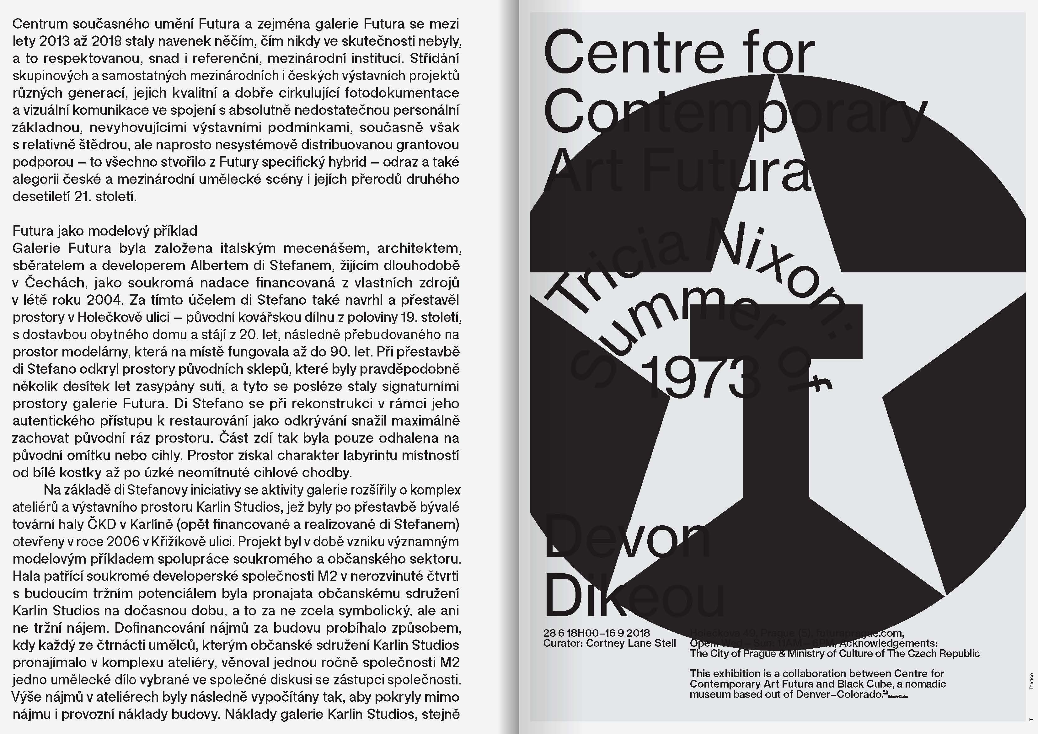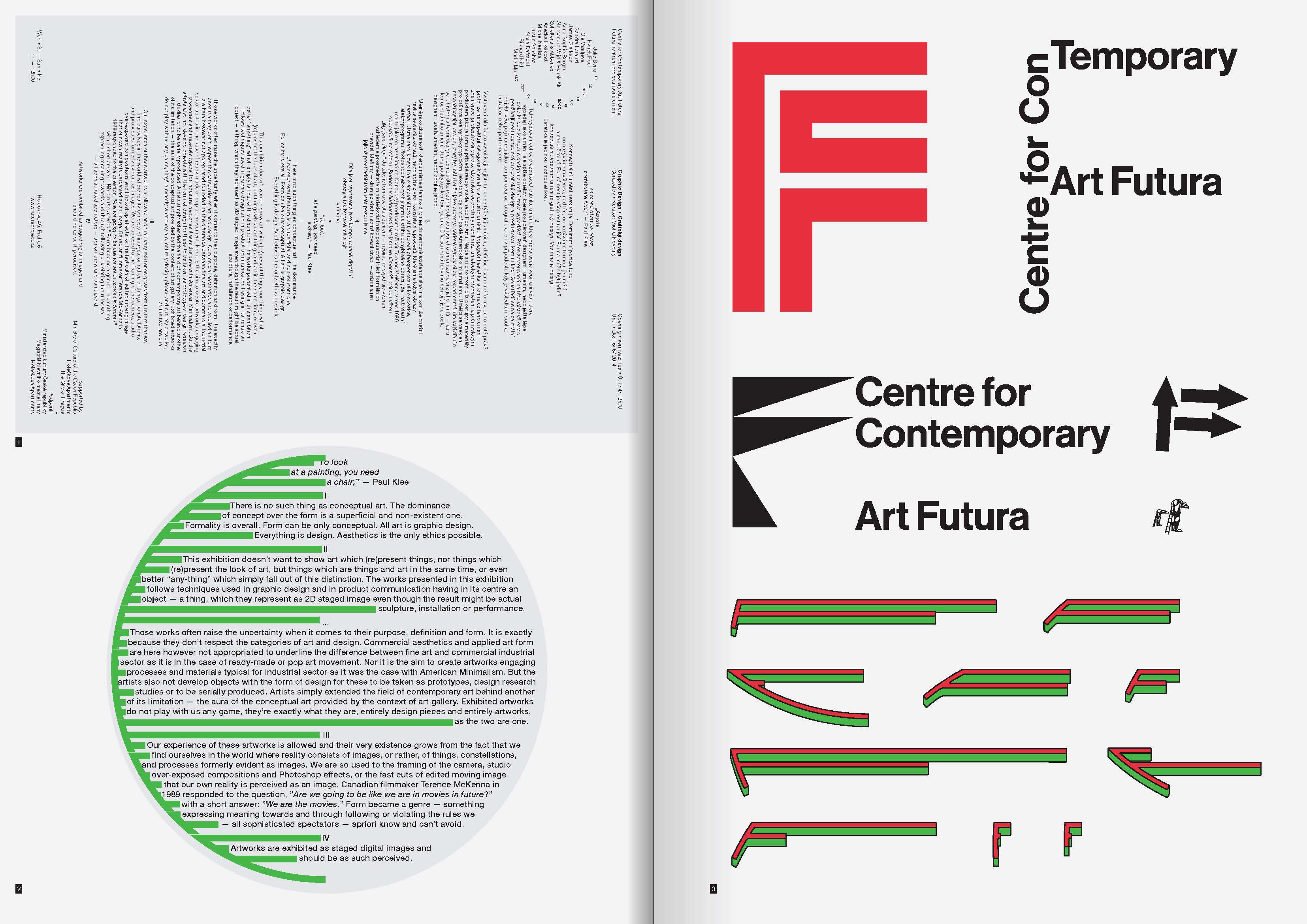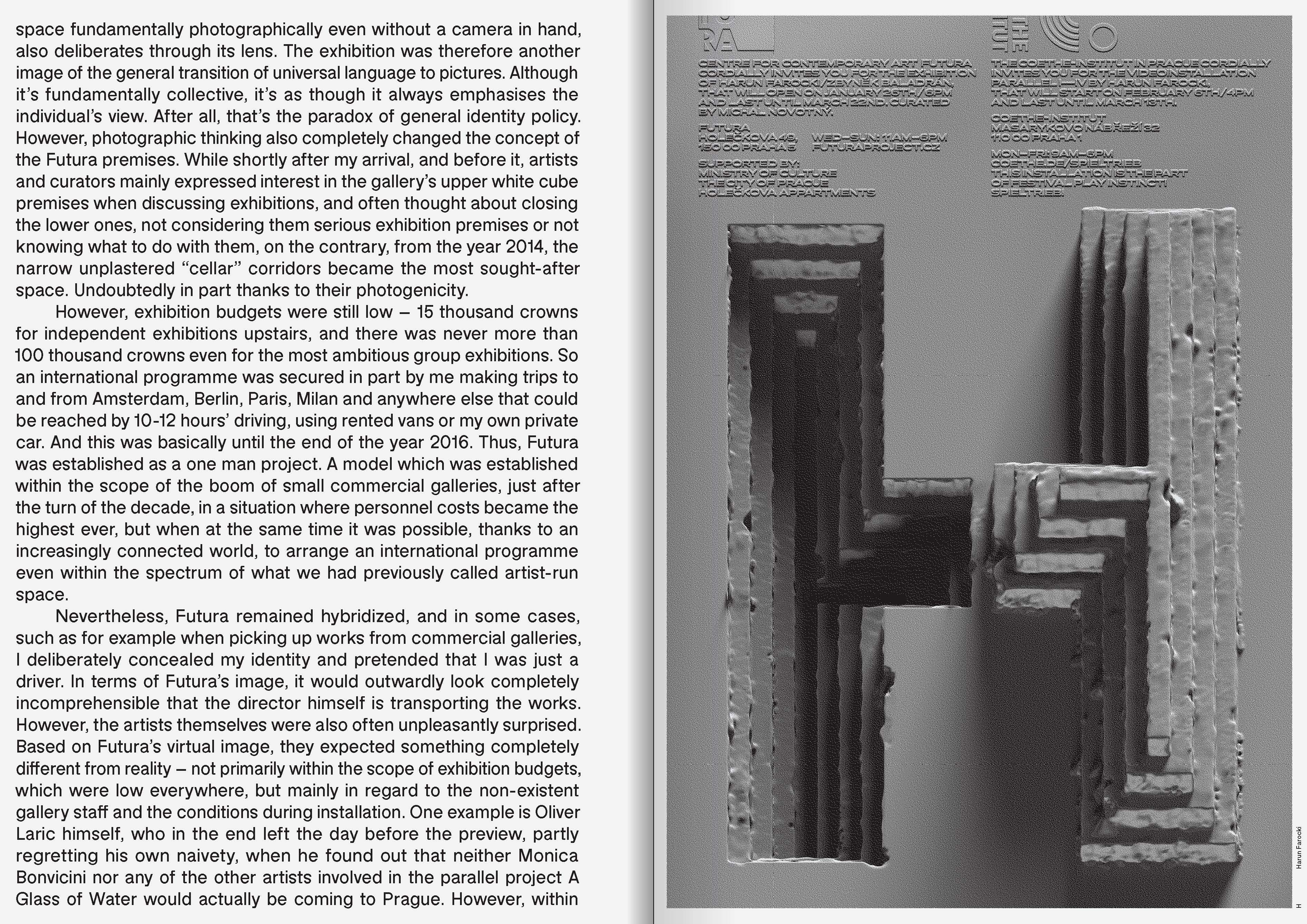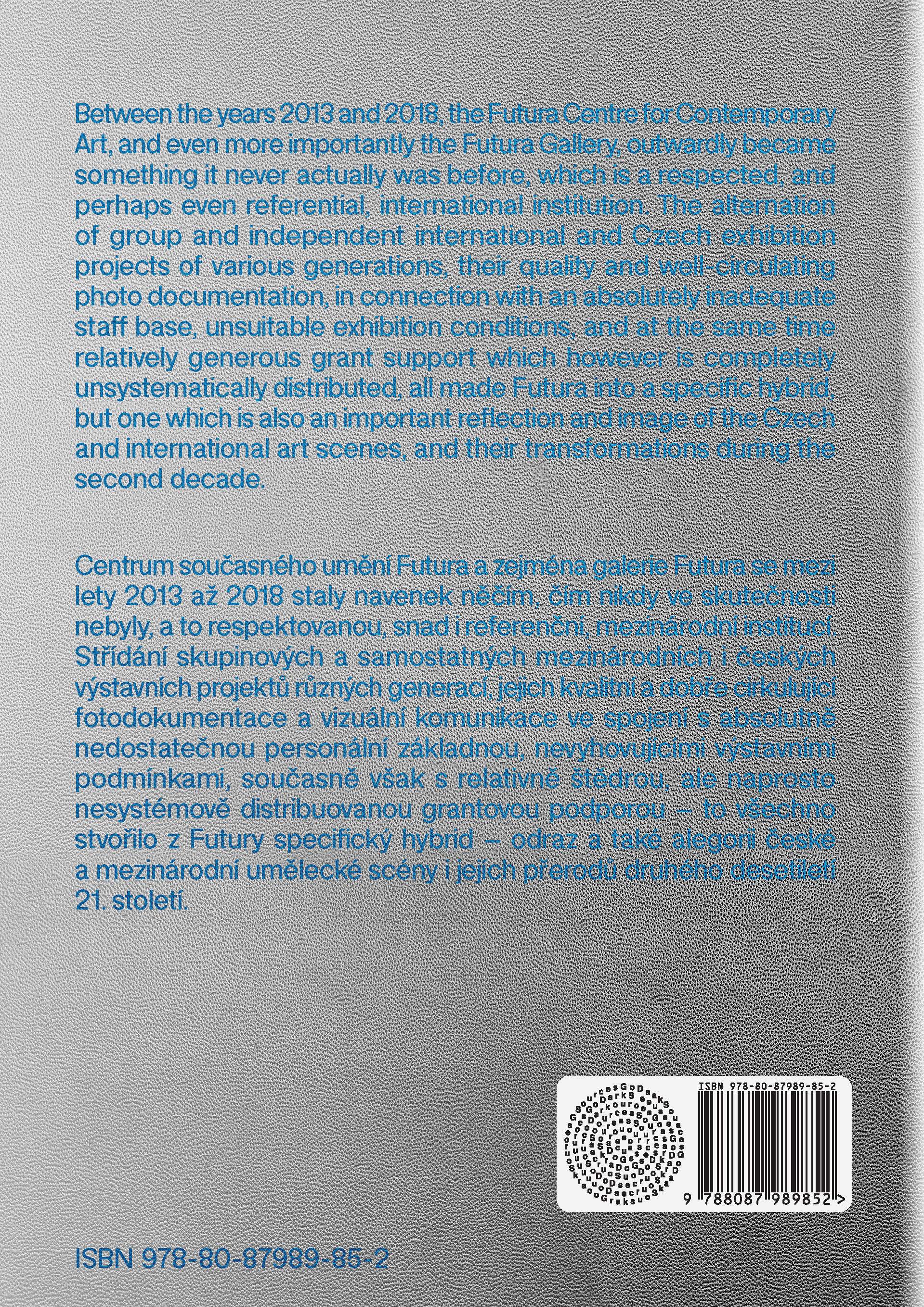 Publikace, jejímž tematickým rámcem je vztah mezi grafickým designem a volným uměním, je extenzí autorovy doktorské práce. Publikace je specifickým manuálem – uzavřením a rekapitulací projektu identity Centra pro současné umění Futura, na němž autor spolupracoval pět let. Knížka též obsahuje rešerše a reflexe tématu identit kulturních institucí, představuje výsledky a především proces tvorby identit, jež jsou spjaty s konkrétními tvůrci, umělci, kurátory nebo spolupracovníky, aluze z historie grafického designu či výtvarného umění a technických postupů, písmových vzorníků, tedy také neautorských vizuálních materiálů. Zvláštní pozornost je věnována adekvátnímu výtvarnému a technickému zpracování. Grafika Jan Brož a Michal Landa (Parallel Practice).