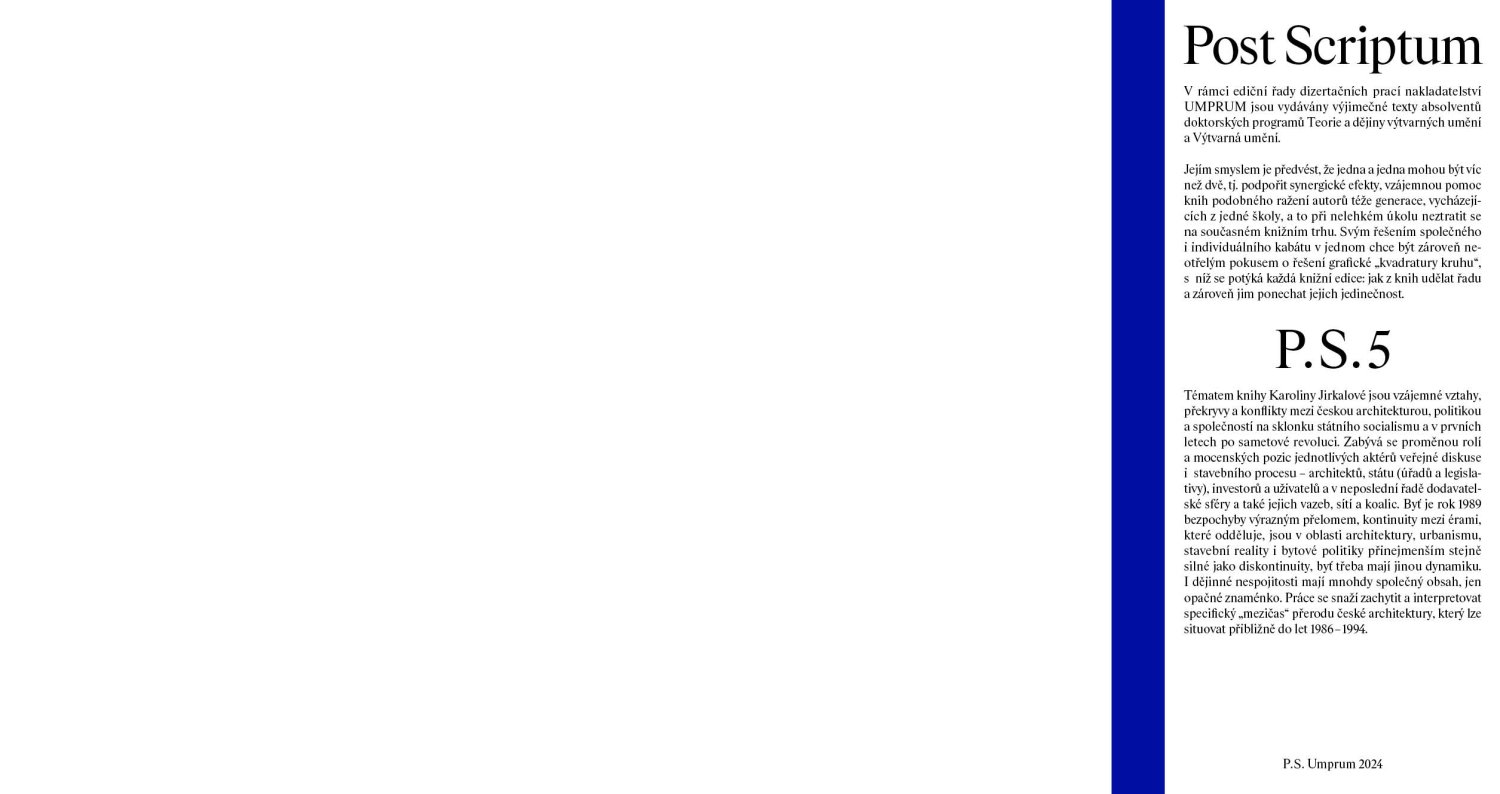 Tématem knihy Karoliny Jirkalové jsou vzájemné vztahy, překryvy a konflikty mezi českou architekturou, politikou a společností na sklonku státního socialismu a v prvních letech po sametové revoluci. Zabývá se proměnou rolí a mocenských pozic jednotlivých aktérů veřejné diskuse i stavebního procesu – architektů, státu (úřadů a legislativy), investorů a uživatelů a v neposlední řadě dodavatelské sféry a také jejich vazeb, sítí a koalic. Byť je rok 1989 bezpochyby výrazným přelomem, kontinuity mezi érami, které odděluje, jsou v oblasti architektury, urbanismu, stavební reality i bytové politiky přinejmenším stejně silné jako diskontinuity, byť třeba mají jinou dynamiku. I dějinné nespojitosti mají mnohdy společný obsah, jen opačné znaménko. Práce se snaží zachytit a interpretovat specifický „mezičas“ přerodu české architektury, který lze situovat přibližně do let 1986–1994. Grafika Anežka Hrubá Ciglerová, Richard Wilde (publikum.design).