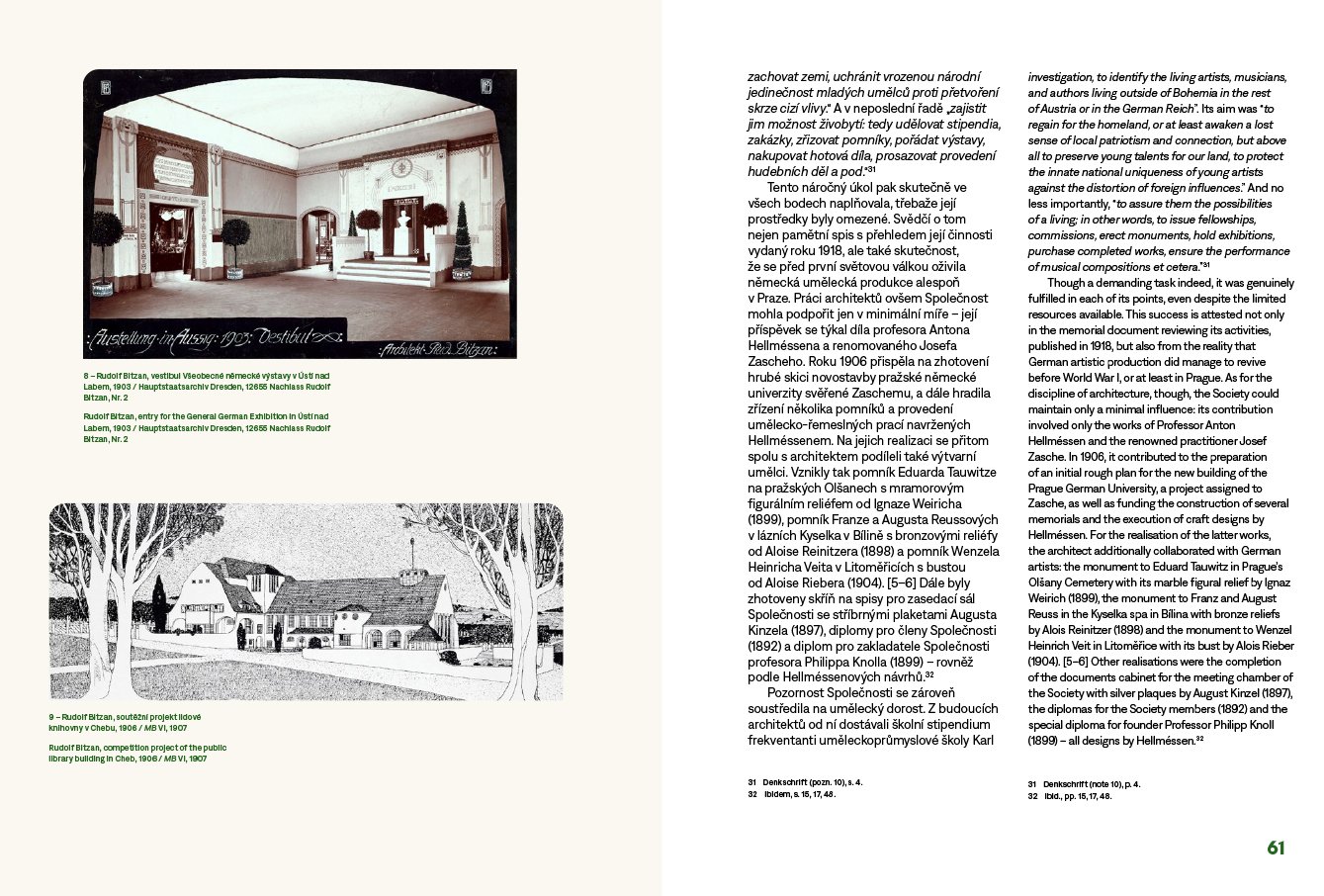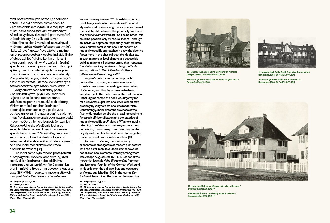 Kolem roku 1900 se na umělecké scéně v Čechách prosazuje moderna. Proces české národní emancipace vrcholí a sebevědomé české umění se více otevírá západnímu světu. Oproti tomu němečtí umělci v Čechách, náležící dosud k širokému německému kulturnímu okruhu, si svou osobitou identitu teprve začínají uvědomovat. Soupeří tak s českými kolegy, kdo se jako první zařadí do mezinárodního rozvoje moderny, ale zároveň je pro jejich tvorbu důležitá vlastní svébytnost a přináležitost ke kulturní tradici české země. Jak se tyto na první pohled neslučitelné intence projevily v tehdejší architektonické produkci? Dnes máme tendenci nazírat architekturu českých Němců ve srovnání s českou tvorbou jako méně moderní. Není ale tento pohled zkreslen naší snahou sledovat v českém umění v první řadě projevy modernosti, kdežto v umění českých Němců si všímáme především dokladů nacionalismu a tradicionalismu? Úkolem této knihy není posoudit, nakolik byla tvorba českoněmeckých architektů kolem roku 1900 moderní. Cílem je spíše představit ji jako integrální součást soudobého evropského diskurzu. Chceme ukázat, že za jejím tradicionalismem nemusely stát nacionální intence, ale snaha o návrat k předindustriální jednoduchosti, prostotě a přirozenosti. Moderní architektura přelomu 19. a 20. století měla dvojí tvář: obracela se ke kořenům a přirozené domácí tradici, stejně jako sledovala potřeby nové doby. Jednotlivé kapitoly se věnují nejprve obecnějším otázkám vztahu moderního a tradičního v architektonickém diskurzu kolem roku 1900 a dále probírají problematickou situaci německého umění v Čechách. Následně se kniha zaměřuje na vedoucí osobnosti pražské i regionální českoněmecké architektury, na jejichž tvorbě ukazuje různé způsoby vztahování se k modernímu a lokálnímu. Publikaci provázejí četná vyobrazení sestávající převážně z historických fotografií a archivních materiálů. Grafika Petr Krejzek. Vychází v česko-anglické jazykové mutaci. Výzkum a vydání knihy podpořila v letech 2018–2022 Grantová agentura České republiky (reg. č. projektu 18-04816S, Hledání identity: Architektura českých Němců 1891–1918).