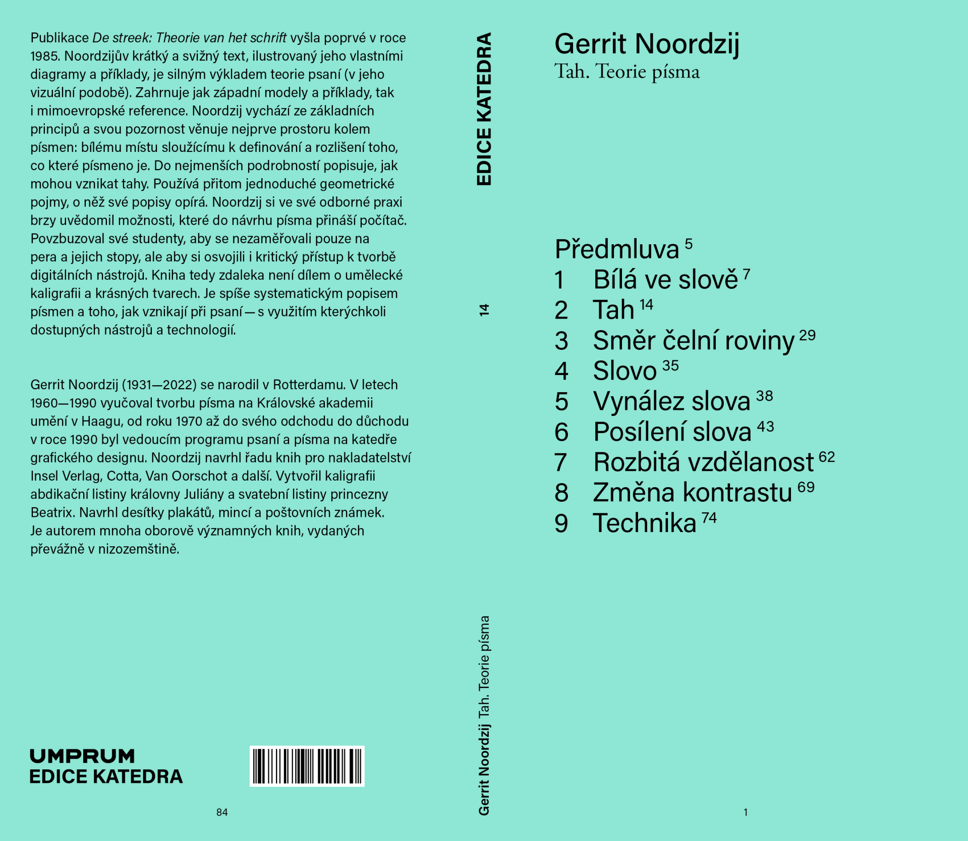 Publikace De streek: Theorie van het schrift vyšla poprvé v roce 1985. Noordzijův krátký a svižný text, ilustrovaný jeho vlastními diagramy a příklady, je silným výkladem teorie psaní (v jeho vizuální podobě). Zahrnuje jak západní modely a příklady, tak i mimoevropské reference. Noordzij vychází ze základních principů a svou pozornost věnuje nejprve prostoru kolem písmen: bílému místu, které slouží k definování a rozlišení toho, co které písmeno je. Do nejmenších podrobností popisuje, jak mohou vznikat tahy. Používá přitom jednoduché geometrické pojmy, o které své popisy opírá. Noordzij si ve své odborné praxi brzy uvědomil možnosti, které do návrhu písma přináší počítač. Povzbuzoval své studenty, aby se nezaměřovali pouze na pera a jejich stopy, ale aby si osvojili i kritický přístup k tvorbě digitálních nástrojů. Kniha tedy zdaleka není dílem o umělecké kaligrafii a krásných tvarech. Je spíše systematickým popisem písmen a toho, jak vznikají při psaní – s využitím kterýchkoli dostupných nástrojů a technologií. Překlad z nizozemštiny Magda de Bruin Hüblová. Grafika Kateřina Šuterová.