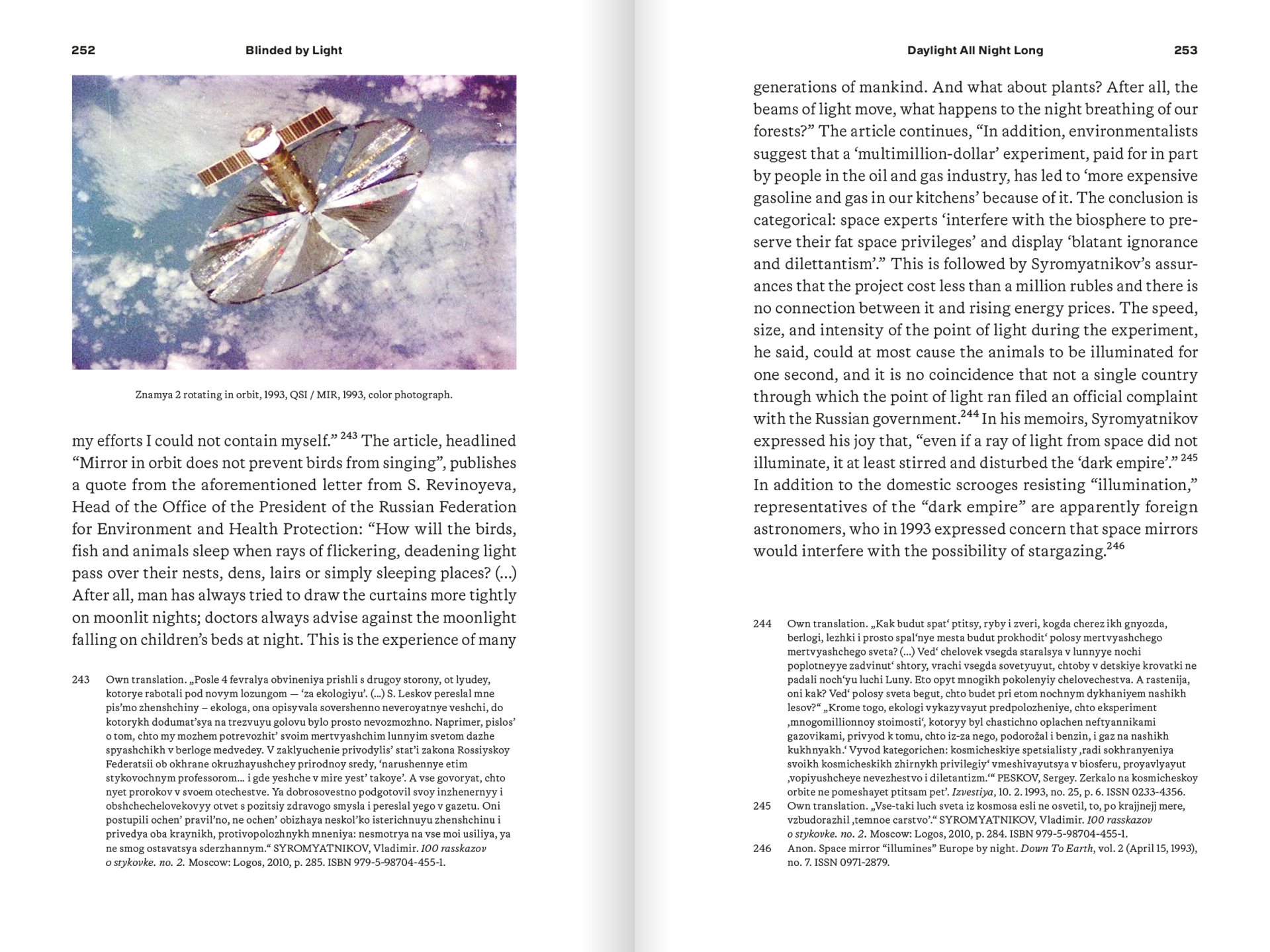 Je neustálé osvětlení stírající rozdíly mezi dnem a nocí snem modernity, anebo noční můrou? Když si posvítíme do těch nejtemnějších koutů, znamená to skutečně i to, že lépe vidíme a všemu rozumíme? Nebo nás všudypřítomný jas může i oslepit? První část této knihy vymezuje a shrnuje dosavadní výzkum tématu kolonizace noci a sleduje její důležité projevy od starověku do současnosti. Druhá část už je specifičtěji orientovaná na problematiku osvětlování nočních oblastí vesmírnými zrcadly. Vůbec poprvé komplexně mapuje historii těchto plánů od jejich počátku ve 20. letech 20. století až do současnosti a zasazuje je do sociálního, politického, kulturního a environmentálního kontextu. Grafika Jan Novák, Nikola Ivanov. Vychází česko-anglicky.