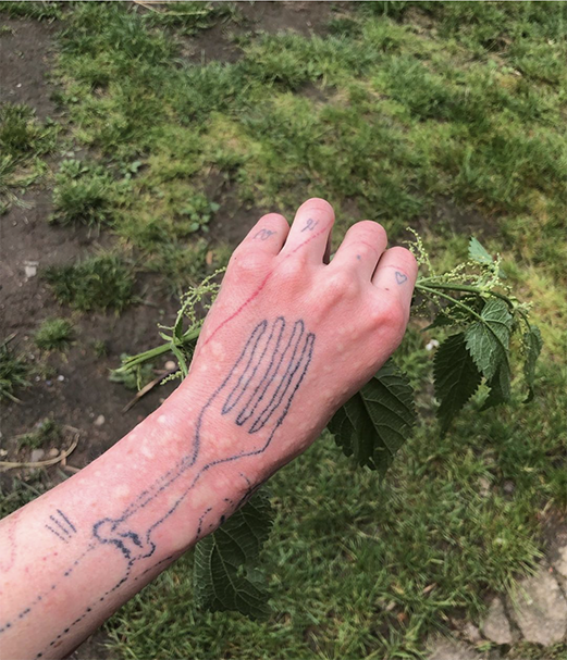 Sarah Dubná je vizuální umělkyně žijící a pracující v Praze. V roce 2020 zakončila studium na Akademii výtvarného umění v Praze prací, v níž kombinuje svůj charakteristický zájem o kresbu v prostoru a téma péče o včely. Včelám se věnuje jak profesně, tak i tematicky – včely se však nestávají v jejích dílech jen předmětem jakéhosi příběhu, ale spíše důležitým aktérem poukazujícím na paraziticko-symbiotický vztah mezi lidským a ne-lidským. Tak, jako Dubná hledá ve své práci tatérky hranice snesitelnosti a propustnosti materiálu (ať už je jím textil, zeď nebo lidská kůže), tak i včela bodá do těla, aby ho léčila a zraňovala zároveň. Kromě včel pak do její tvorby vstupují i další organismy nebo rostlinné druhy (jako například kopřivy), k nimž si Dubná hledá cestu v rámci diskurzů posthumanismu a queer teorie.