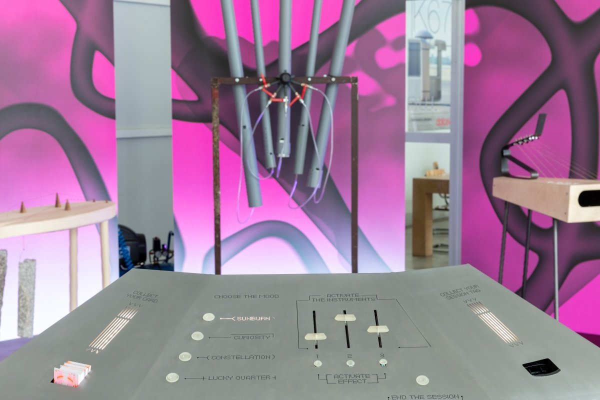 The multimedia student project of UMPRUM.wav was presented in the entrance area of Studio Hrdinů. It offers a way to understand the structure of music and is a unique view of musical instruments. It was first presented during this year's Milan Design Week. The project, dominated by the Studio of Product Design led by Michal Froňek and Jan Němeček, offers a way to perceive music and musical instruments from an unconventional perspective. The connection between the world of music and the world of design was presented through unique original musical instruments combining unconventional acoustic and visual compositions. A special mixing console invited visitors to play with sound and immerse themselves in the duality of analogue and digital, acoustic, and visual experimental experience. The collaborative project is the culmination of cooperation across product, graphic, and digital design, as well as a long-term collaboration between designers, leading Czech musicians, and music theorists. For example, the musician and composer Never Sol and the company Quix actively participated in the project.