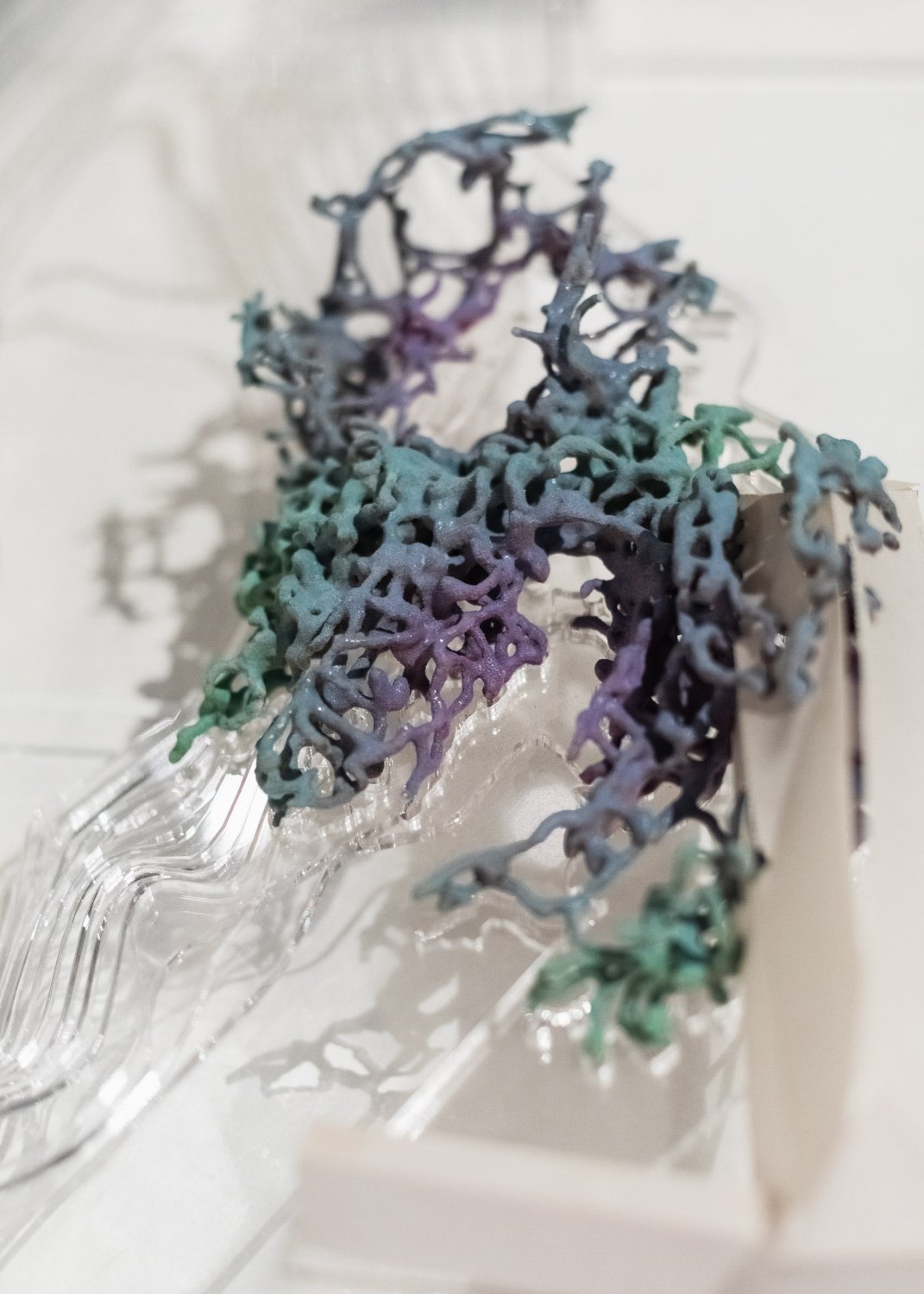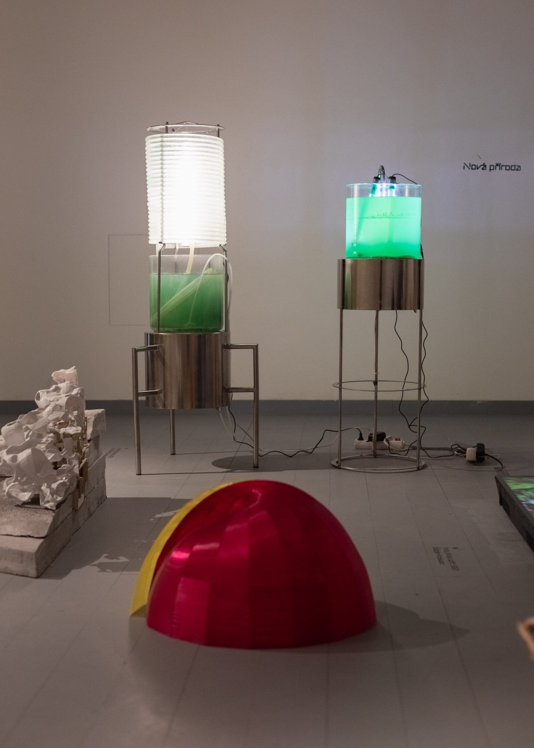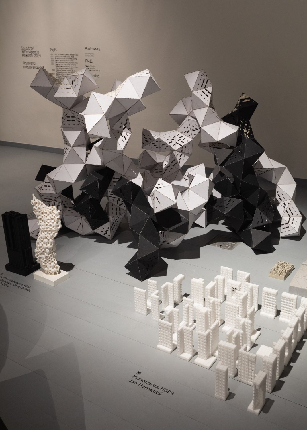"The installation strategy provides food for thought about the nature of how and from what physical exhibits are generated. It is deliberately conceived in such a way that the exhibits have no pedestals but are directly placed on the floor. They emerge from something hidden beneath the surface, something that itself does not necessarily have a similarly solid, stable, physical nature." Cyril Říha, the curator of the exhibition and teacher at UMPRUM, refers to the important role of virtual, and digital processing and the use of artificial intelligence.