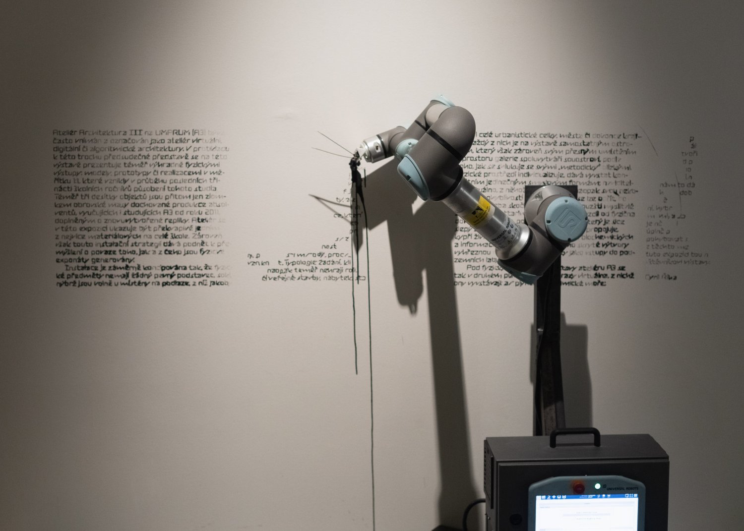 The exhibition features a robotic arm generating text that describes the timeline and details of individual projects on the gallery walls throughout the exhibition, showcasing it as one of the contemporary tools used in studio creation.
