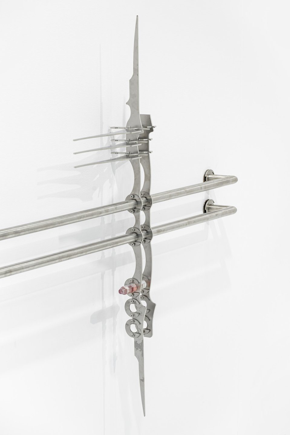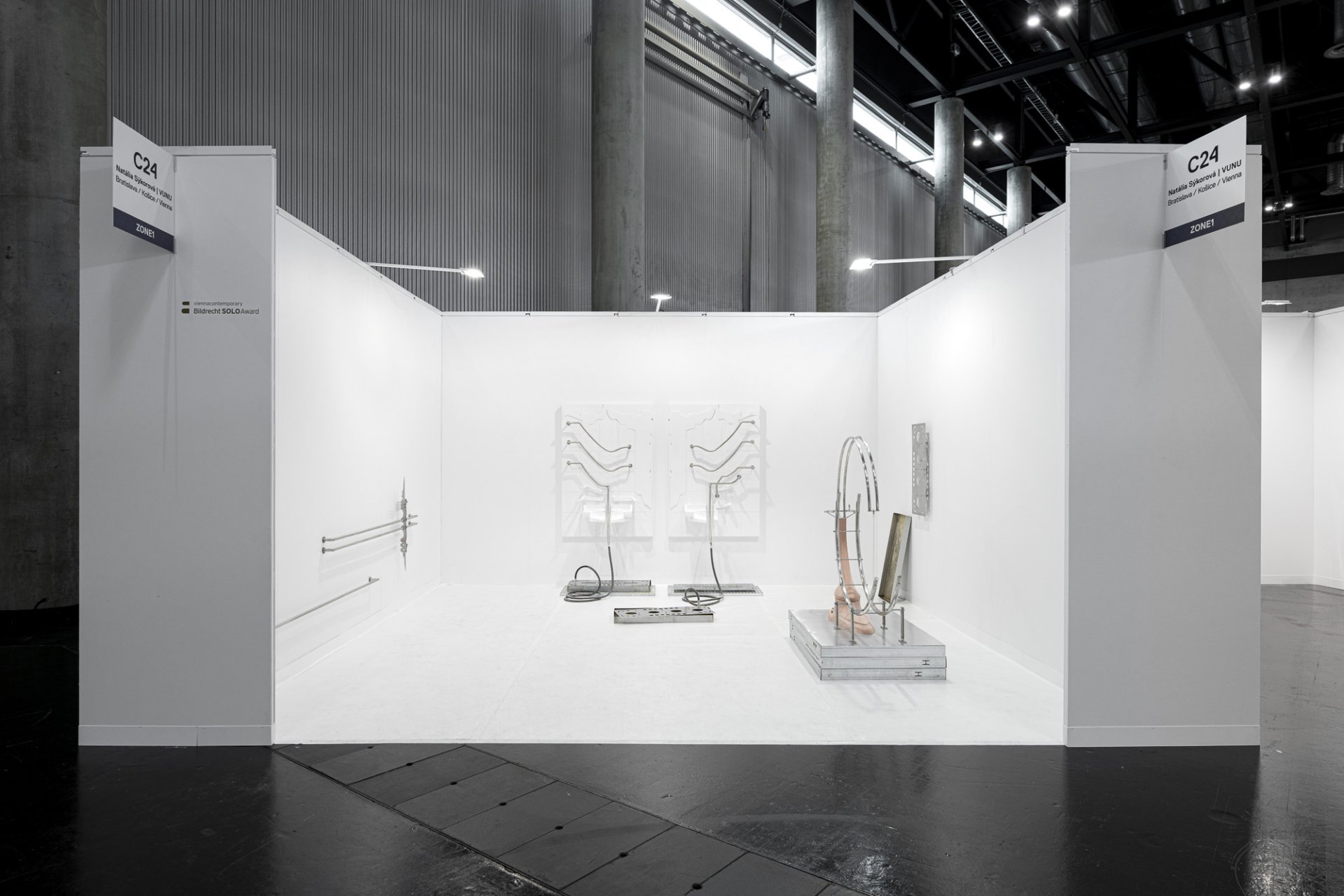“The presentation of Natália Sýkorová within VUNU, Zone 1, features sculptural arrangements in a multisensory ensemble permeated with performative gestures. It breaks down infrastructural complexities and explores the element of water in its multifaceted contexts. Open containers, organic forms, extended prostheses, and the ambivalence between destruction and healing testify to the fragility of human existence in interplay with nature. At the same time, technical fragments are infused with new life through abstraction from their original function. By awarding the prize to VUNU, the jury of the viennacontemporary | Bildrecht SOLO Award also emphasizes the importance of the Bratislava gallery scene and acknowledges the gallery’s new presence on Florianigasse in Vienna.”