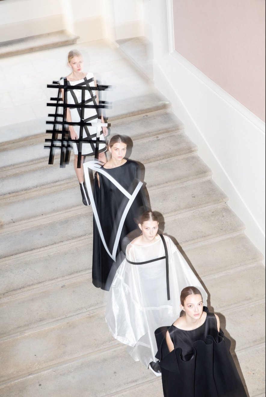 VIVE LA FRANCE, a collection of 15 selected models by students of the studio, is united not only by the theme but also by a very thorough preparation and execution. Detailed research preceded each collection. The proposed models were then created with reference to haute-couture workmanship, with an emphasis on craftsmanship and a large amount of handwork.