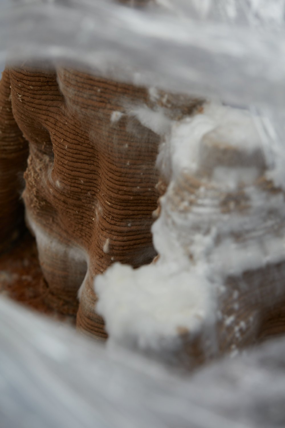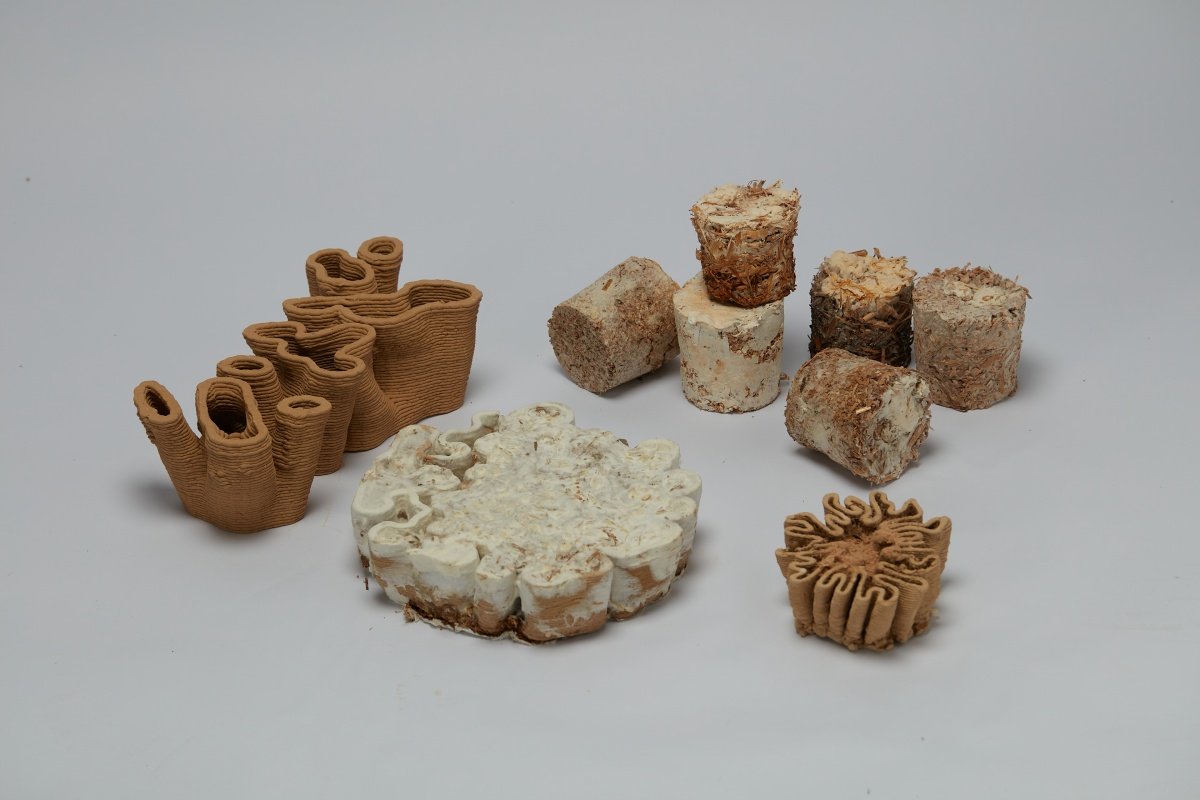 Myceelab responds to the current global climate and environmental crisis. It focuses on the potential of mycelial composites as a sustainable and environmentally friendly material in the built environment. Students from the Studio of Architecture III, led by Imrich Vasek and Shota Tsikoliya, have developed an alternative building material combining clay, lignocellulosic substrate, and fungi. They are exploring its use in industrial processing through digital design and robotic manufacturing.