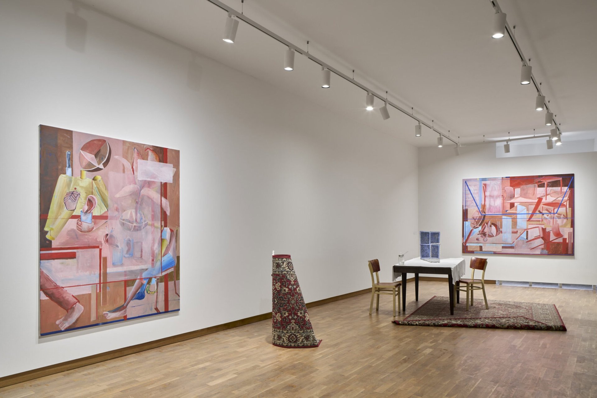 Výstava Padá ticho v GMU v Hradci Králové představuje novou sérii maleb Nikoly Kopp Lourkové, v nichž se ticho stává prostorem soustředění a jemného pozorování. Autorka nechává běžné předměty – židle, jablka, nádoby, špendlíky či fragmenty těla – vystupovat z vrstvené, měkké barevnosti jako vzpomínky zakotvené v osobní zkušenosti. Motivy se objevují spíše v náznaku než v popisu, jako by se pomalu vynořovaly z mlžného pozadí. Malba pracuje s křehkou paletou růžových, okrových a tělových tónů, které doplňují výraznější barevné akcenty a jemně přerušené linie. Ticho zde není prázdnotou, ale pozorností – chvílí, kdy se svět ukazuje v detailech, jež jindy unikají.