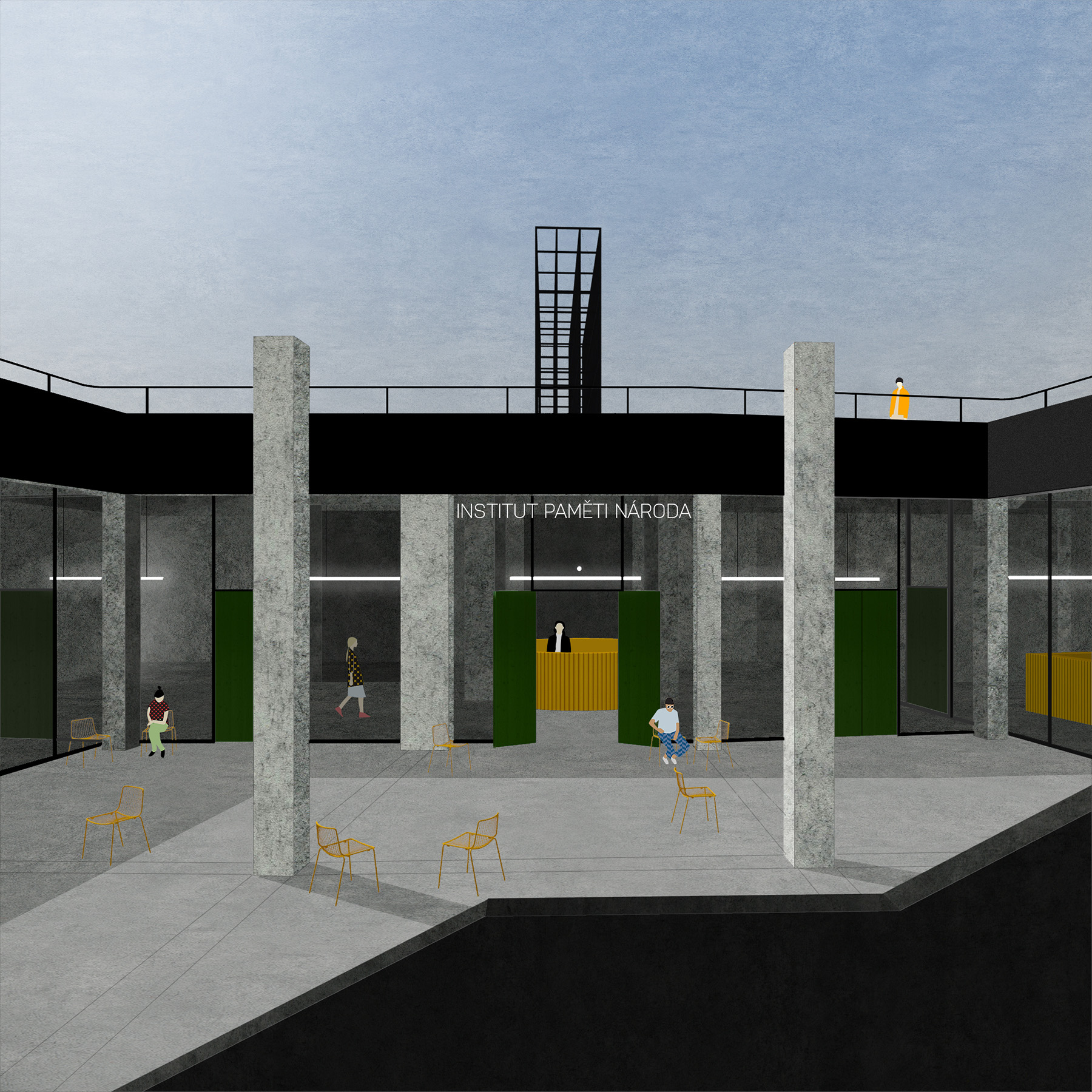 Navrhuji Institut paměti národa do podzemí bývalého Stalinova pomníku na Letné. Vzniká zde archiv, kanceláře institutu, knihovna se studovnou, bookshop, kavárna, multifunkční sál a kinosál. Téměř polovinu plochy věnuji výstavě Příběhů 20. století. Vrcholem výstavy je výhled na Prahu skrz sokl, z nějž na povrch vyrůstá lešení – symbol opravy starého, výstavby nového, připomínka toho, co zde kdysi bylo. Svým zásahem nemažu paměť místa, pouze přidávám novou vrstvu.