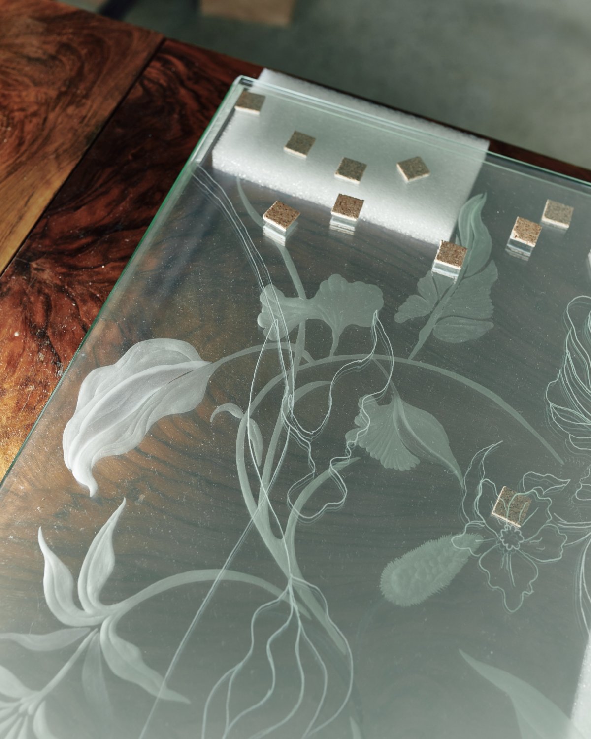 Záměrem této práce jež staví na staletých zkušenostech rytců, řemeslníků a historických dobových mobiliářích bylo vymanit rytinu z klasického použití, rozměrů, posunout ji do většího měřítka a propojit ji s moderním designem a současným životním stylem. Je to návrat k řemeslu art deca a raritním, unikátním kusům dokonale zpracovaného nábytku, ale i k manýristickým kabinetům kuriozit, které mají v rudolfínské Praze tradici. Skleněné tabule polopropustných zrcadel darovány firmou AGC.