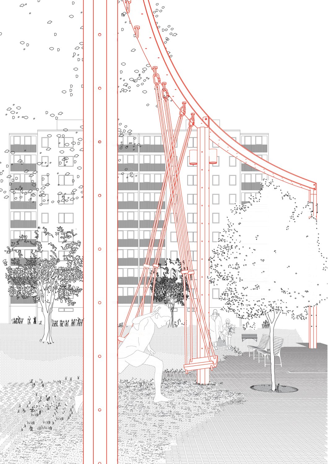 Práce je zaměřena na hledání koncepce veřejných prostranství na sídlišti, a to na pražském Jižním městě. Soustřeďuji volnočasové prvky a aktivity do jednoho místa - lokálního centra - romantického parku. Plynoucí prostor pomyslně ukotvuji kruhovou konstrukcí – altánem, kde základním prvkem je ocelový stožár a nosník. Upravuji měřítko prvků z malých drobků na adekvátní velikost tohoto místa. Altán funguje jako kostra pro další dění, pro další uchopení ze stran občanů, pro poskytnutí zázemí pro různé sousedské akce. Místo je navrženo tak, aby bylo flexibilní a mohlo se dále adaptovat dle budoucích potřeb.
