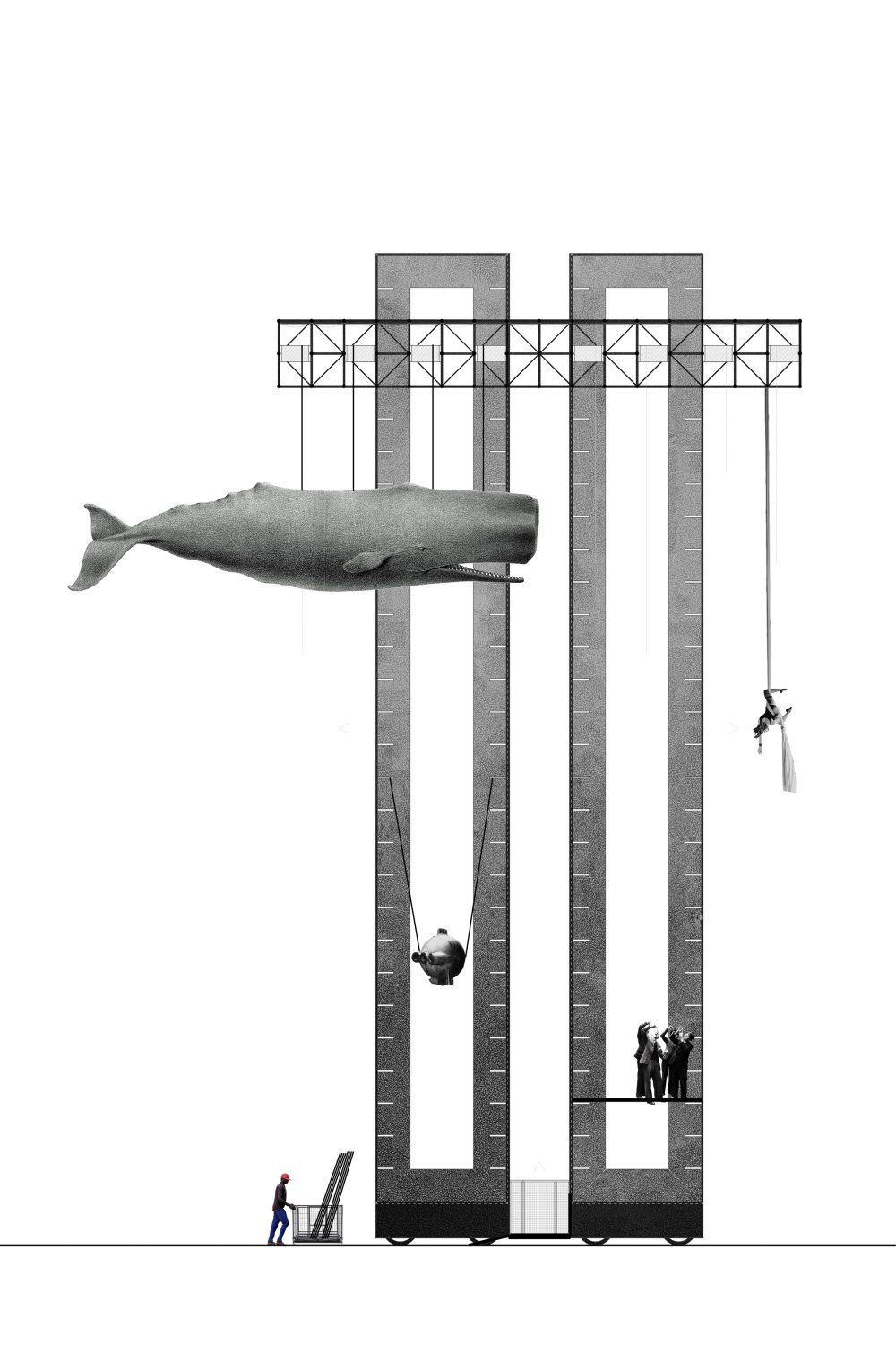 Obracím zavedenou divadelní typologii a proces vývoje inscenací obaluji veřejným životem. Vytvářím divadelnímu světu zázemí, které postrádá, dávám prostory veřejným funkcím, zkušebnám, workshopům, dílnám a vzájemně je propojuji a otevírám. Divadlo má fungovat jako stroj. V navrhovaném divadelním prostoru ulice V Kotcích má každý dům své zaměření, ale mění se v závislosti na potřebách těch kdo ho naplňují. Ulice je scénou kde se hranice mezi životem a divadlem maže. Pohyblivou páteř celku tvoří stroj vložený do jeho nitra.