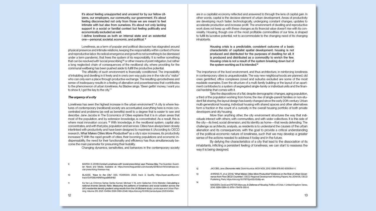 Naléhavost otázky urbánní osamělosti slouží jako výchozí bod pro analýzu odcizujících okolností současného města. Prostřednictvím historického mapování pocitu osamělosti, s využitím jazyka jako návodu, vysledovávám jeho původ s nástupem modernity (průmyslová revoluce, sekularizace, rapidní urbanizace,...). Objasňuji jeho urputnost v současném městě a dokazuji jeho souvislosti s neoliberálním systémem a postupnou komodifikací městského prostředí. Vytyčuji specifické rysy městské struktury, které umocňují pocit osamělosti a odloučenosti a činí z města prostředí, v němž je obtížné se zabydlet [to dwell]. Na základě získaných poznatků nastiňuji cesty, jak odcizující okolnosti adresovat a jak tvořit přívětivější město.