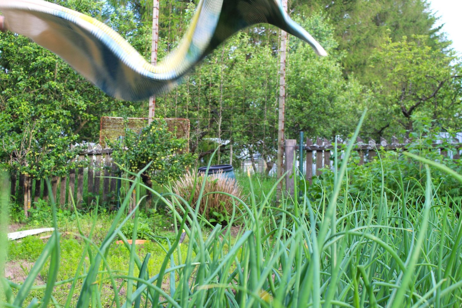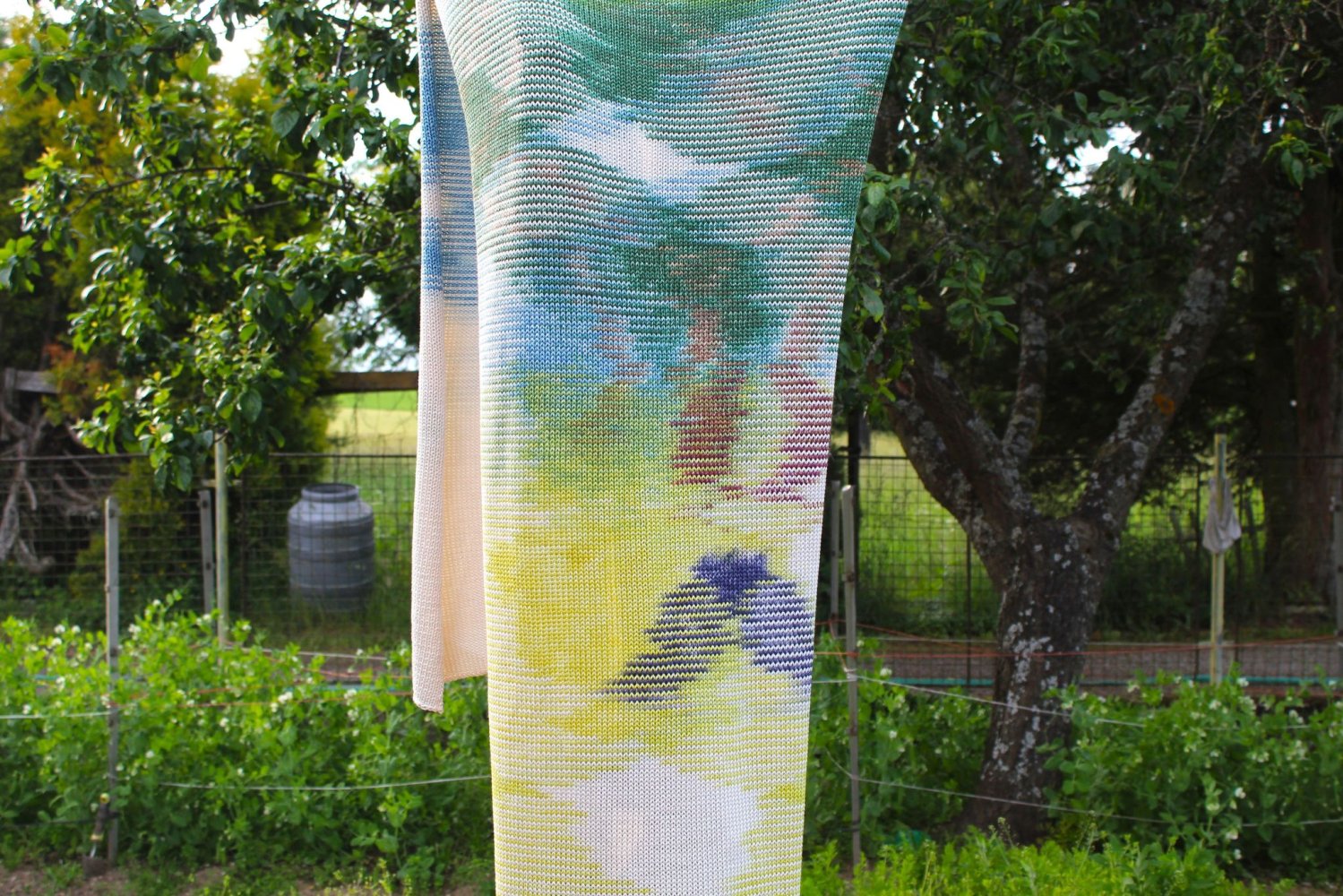 Zahrada jako bezpečný prostor. Místo, které člověk ovlivňuje, formuje a zvelebuje k obrazu svému, naproti tomu, jak zahrada ovlivňuje nazpět jej. Sledovala jsem bilanci zahrady, jako prostoru na hranici přírodního a uměle vytvořeného místa. Vůdčí inspirací se stala zahrada mojí babičky, která leží v pohraničí jižních Čech. Citlivým vhledem do uzavřeného prostranství zeleně, demonstruje blízký vztah člověka a jeho okolí. Výsledná práce se skládá ze série pletených dek, pastelových kreseb a audiozáznamu. Pletenina svým formátem přejímá bezpečný prostor zahrady a přenáší jej do interiéru. Spojnicí se stává pletený plot, který vymezuje zahradu od okolního prostoru, stejně jako deka rámuje a chrání tělo od okolních vlivů.