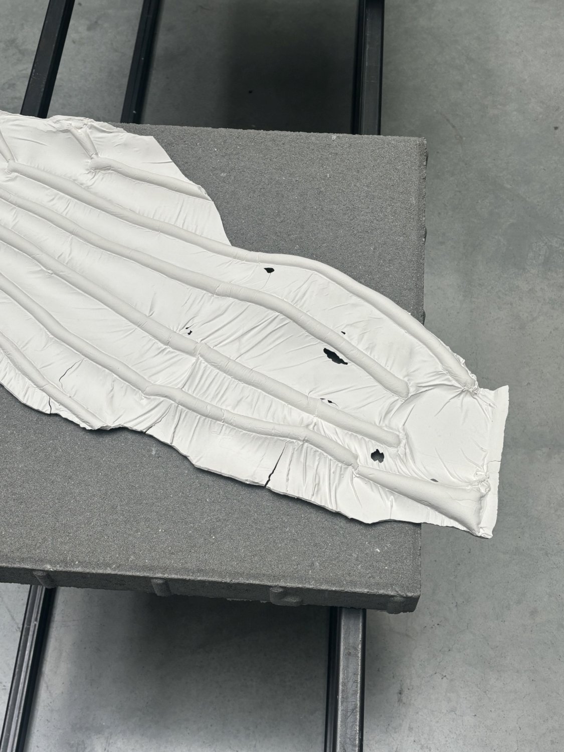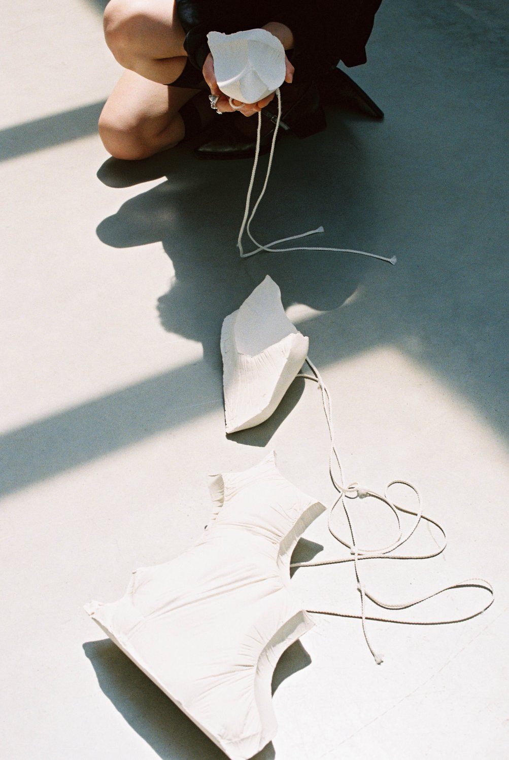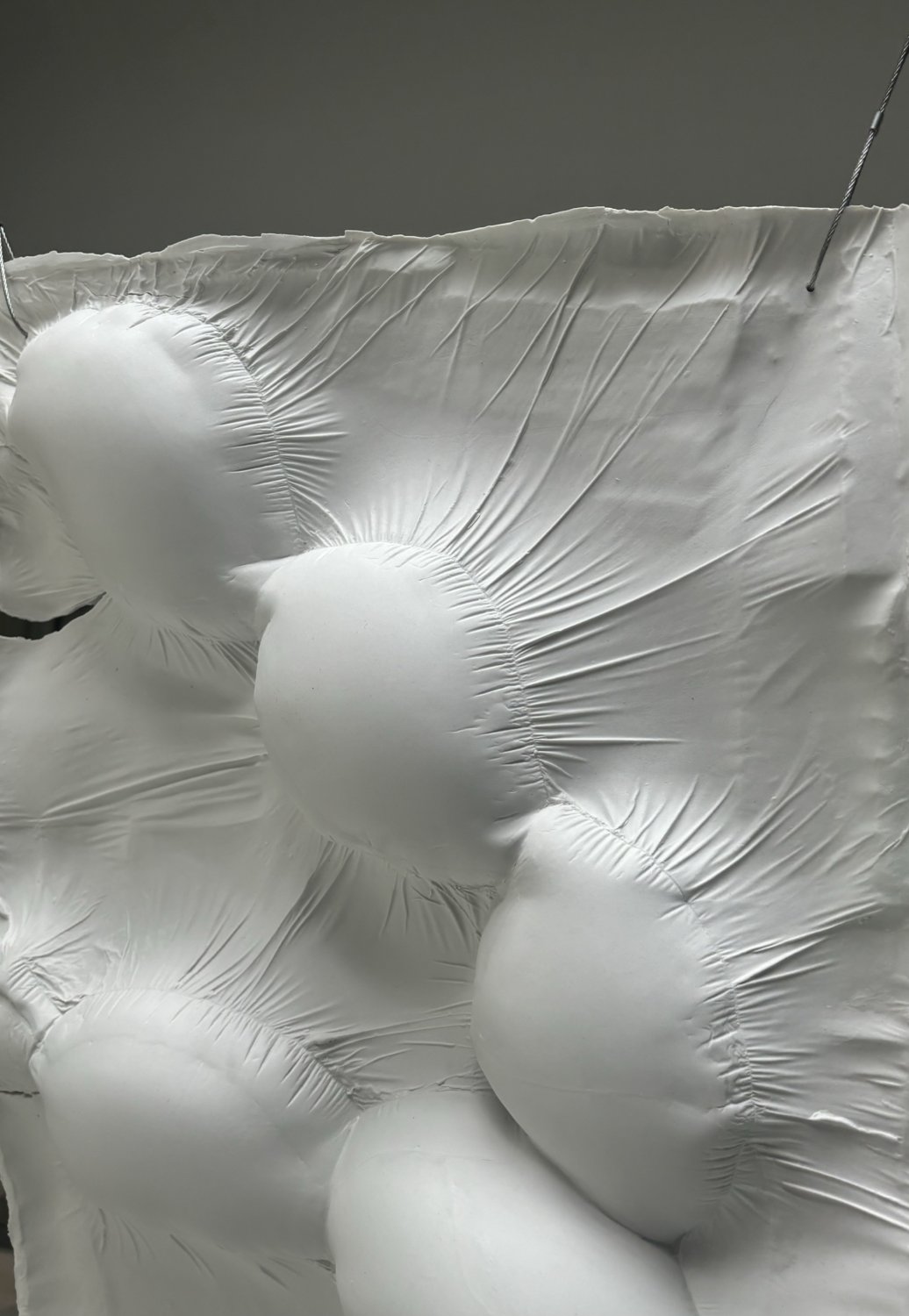 Utváranie identity ako kontinuálneho procesu premeny. Svoje porozumenie pojmu identity, vychádzajúcej z koncepcie teoretika psychológie Erika Eriksona, budujem v konfrontácii s materiálmi. Keramika nesie hmatateľnú stopu premeny, ktorú uchopujem ako liniu prevedenú do priestorových diel. Premeny materiálu a etapy premien v procese sú podporené textilným materiálom, ktorý mi slúži ako pomocné medzistupňové médium na dosiahnutie jemných delikátnych stôp. Fascinuje ma skúmanie estetiky, ktorá je tvorená rôznymi fázami deštrukcie, vlastného pohybu a podnecuje vo mne dialóg medzi dvoma opozitnými materiálmi - mäkkým a poddajným textilom a pevným no zároveň krehkým porcelánom.