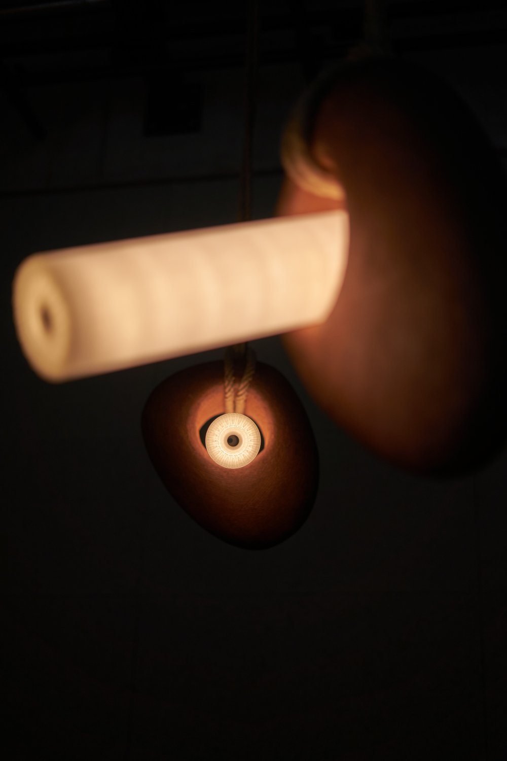 V návrhu kolekce se zabývám vlivem světla na cirkadiánní rytmus. Postupným snižováním pozice světla a změnou jeho barevnosti se připravujeme na kvalitnější spánek. Svítící válce jsou vsazeny do keramických objektů inspirovaných primitivními kamennými nástroji. Zaoblené tvary keramiky napomáhají vzniku gradientů světla a stínu, čímž zvýrazňují strukturu danou ruční výrobou. Výsledný návrh sleduje kontrast vizuálního projevu moderní technologie a řemeslné tvorby.