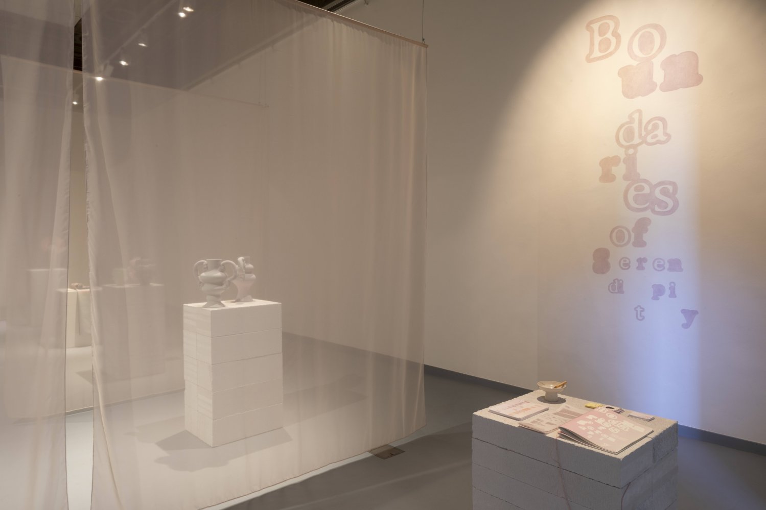 Aktuální výstava v Galerii UM s názvem Boundaries of Serendipity představuje tři mladé umělkyně, absolventky a studentku UMPRUM: Karolínu Kučerovou a sestry Paulu a Františku Benčaťovy. Jejich tvorba se vyznačuje neustálým hledáním a posouváním hranic technik a řemesla. Všechny spojuje hluboká citlivost k časovosti a materiálu, a také vnímavost k podstatě a významu jejich děl.