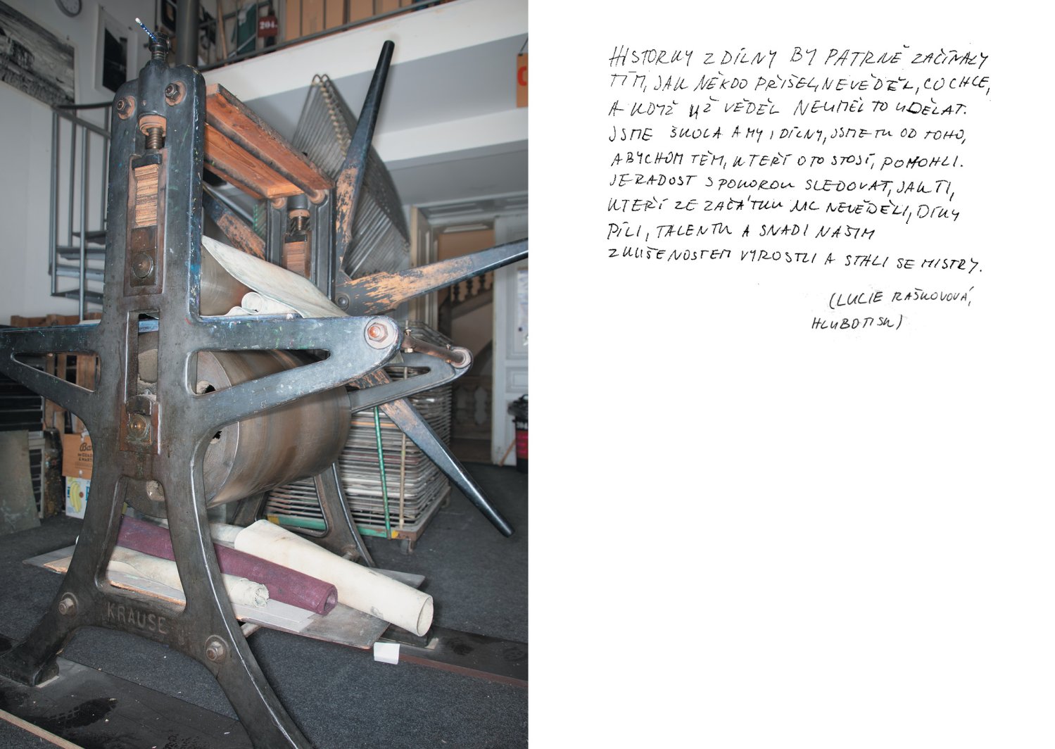 Dílny a jejich mistři na Vysoké škole uměleckoprůmyslové v Praze (UMPRUM) vždy tvořili podstatnou část ducha školy. Publikace zachycuje školní dílny na náměstí Jana Palacha před jejich stěhováním do nové budovy Technologického centra UMPRUM Mikulandská. Cílem bylo zaznamenat otisky času, práce a genia loci místa. Nejedná se o fotografie architektury, strojů ani práce, jde o zaznamenání energie, která z návštěv jednotlivých a různorodých dílen na člověka dýchá. Kniha je opatřena texty rektora UMPRUM prof. Jindřicha Vybírala a architekta Romana Brychty, pod jehož vedením prochází budova na náměstí Jana Palacha rekonstrukcí. Autory fotografií jsou Barbora Žentelová, Lukáš Hlavín a Lorenzo di Grazia. Grafika Žofia Fodorová.