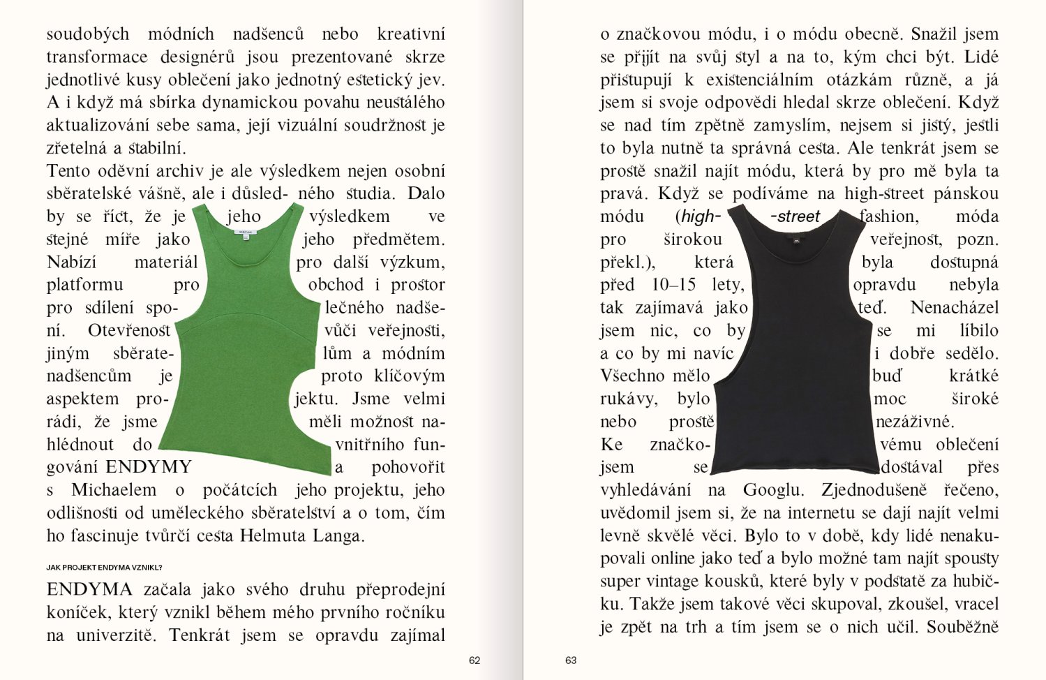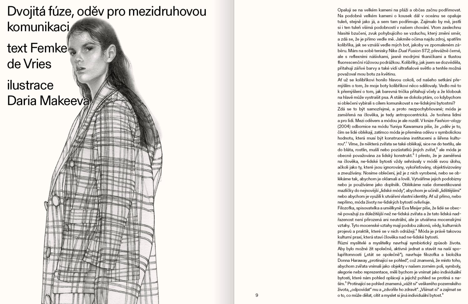 Tématem publikace je nahlédnutí do uvažování o módě v širším sociokulturním kontextu. Reflektuje aspekty a tendence současného nezávislého oděvního designu a věnuje se především teoretickým souvislostem. Pozornost je upřena na autory a jejich díla, u kterých oděv přesahuje svůj užitný rámec, stává se aktivismem, propojuje se s volným uměním, či vstupuje jako narativ do kulturně-sociologického kontextu společnosti. Jde o antologii zahraničních textů a dalších teoretických článků doplněných o rozhovory s autory, tvůrci, teoretiky i odborníky mimo umělecké obory (sociology). V obrazové části jsou zastoupeny projekty a díla zahraničních autorů a fotografie Veroniky Čechmánkové a Terezy Havlínkové. Grafika Jakub Samek.
