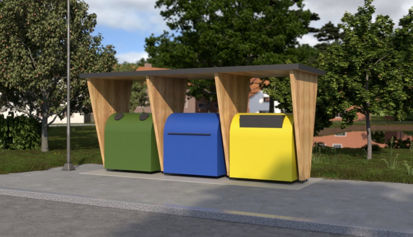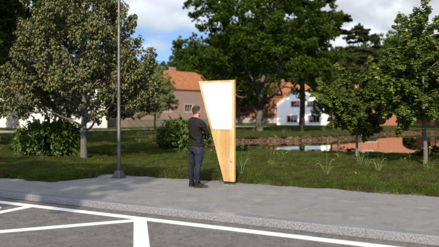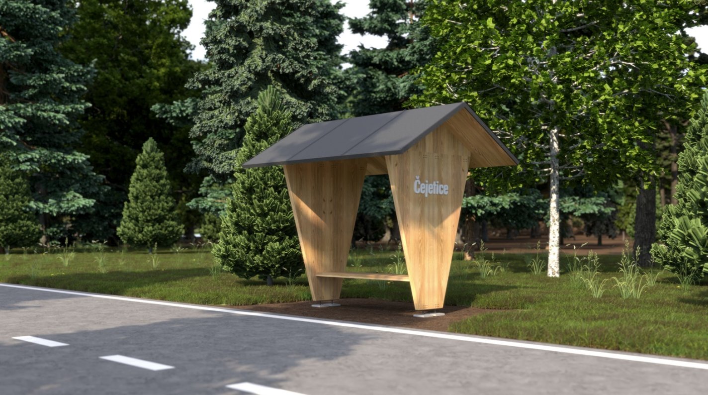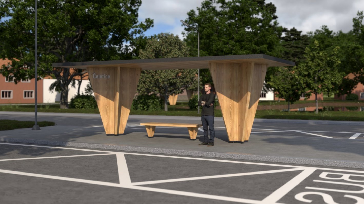 Každý objekt vychází z jednoduchého a efektivního konstrukčního principu – jeden CLT panel je rozříznut úhlopříčně, čímž vzniknou dva shodné díly. Ty se následně využívají jako boční stěny, které nesou střechu, lavičku či jinou funkční část a současně se stávají výrazným architektonickým prvkem celé sestavy. Tento přístup minimalizuje odpad, zjednodušuje výrobu a zároveň vytváří jednotný vizuální jazyk pro všechny prvky mobiliáře. Dřevěná textura CLT panelů zůstává přiznaná, což podtrhuje přírodní charakter materiálu a jeho spojení s místním kontextem. V návrhu je kladen důraz na funkčnost, odolnost a snadnou údržbu.
