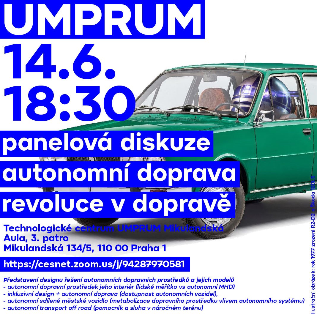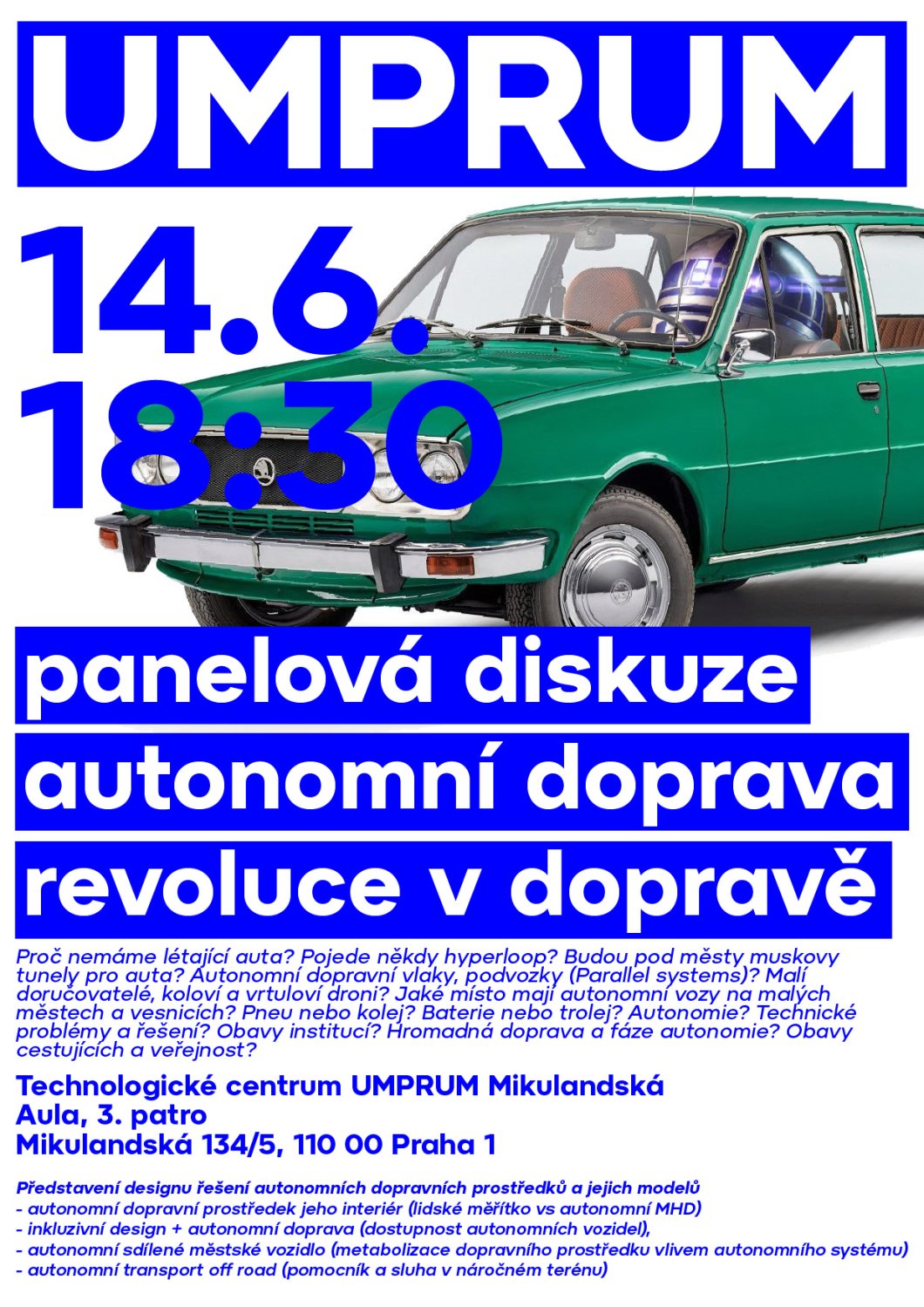 Téma autonomního vozidla se ve společnosti objevuje od 60' let 20tého století a i dříve v románech Julese Verna. Dnešní technologie jsou již blízko tomu, abychom toho dosáhli. Jak se s tímto tématem vypořádat i v šitším kontextu?! Přijďtě se zúčastnit moderované panelové diskuze Robinem Kopeckým do našeho nového Technologického centra UMPRUM.