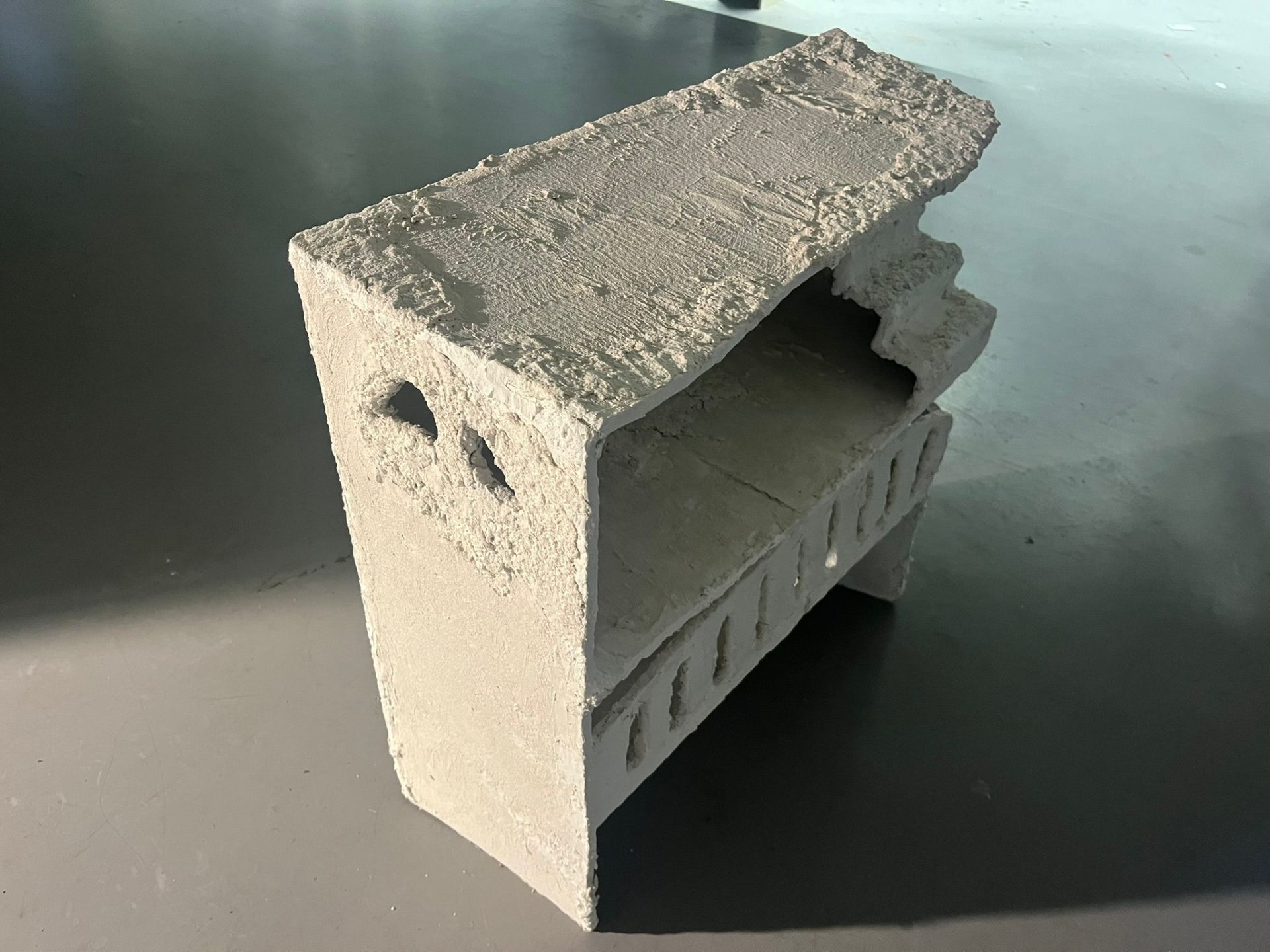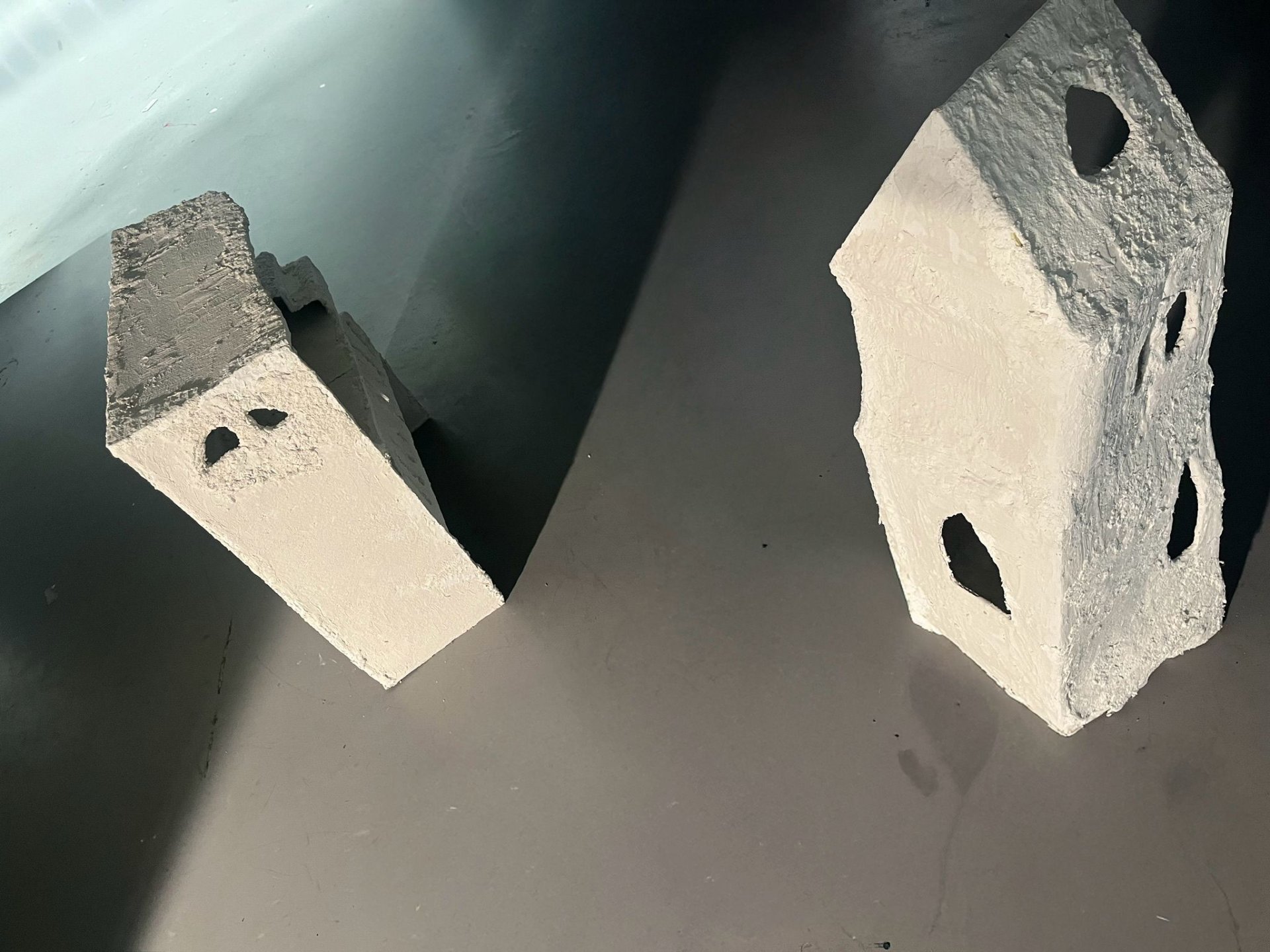 Dva domy, které reprezentují fungování a schopnosti člověka poté, co se jeho základní podpůrný systém rozpadne. Dva domy – neudrží se a nesplní tak svou fundamentální roli, jakou má podpůrný systém pro člověka mít. Dva domy jako pokus o znovuvybudování si prostoru, který byl v minulosti postrádán. Je něco okolo mě, co mě udrží a ochrání před propadem?