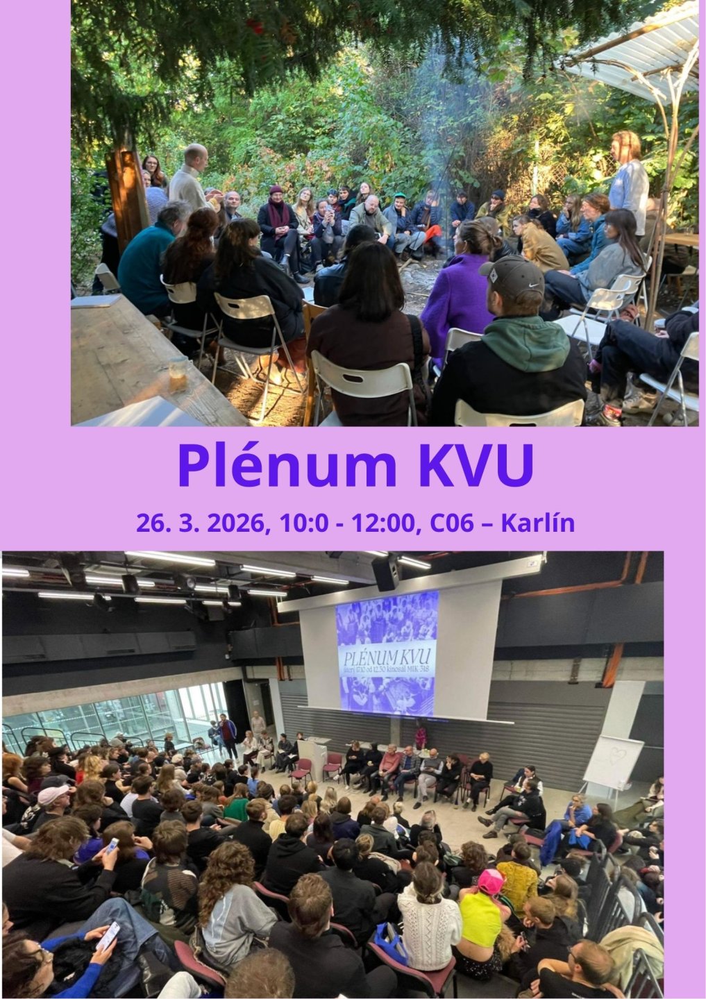 Ve čtvrtek 26. března se v Karlíně (C06) uskuteční tradiční plenární zasedání Katedry volného umění (10:00–12:00). V jarním semestru se zaměříme především na téma akreditace; tj. na zpětnou vazbu týkající se kvality výuky (délka studia, nabízené kurzy, dostupnost dílen, technická podpora a informovanost studujících ....). Studující KVU bychom rádi tradičně požádali o sdílení dalších témat – vašich nápadů a potřeb – která by měla být projednána.