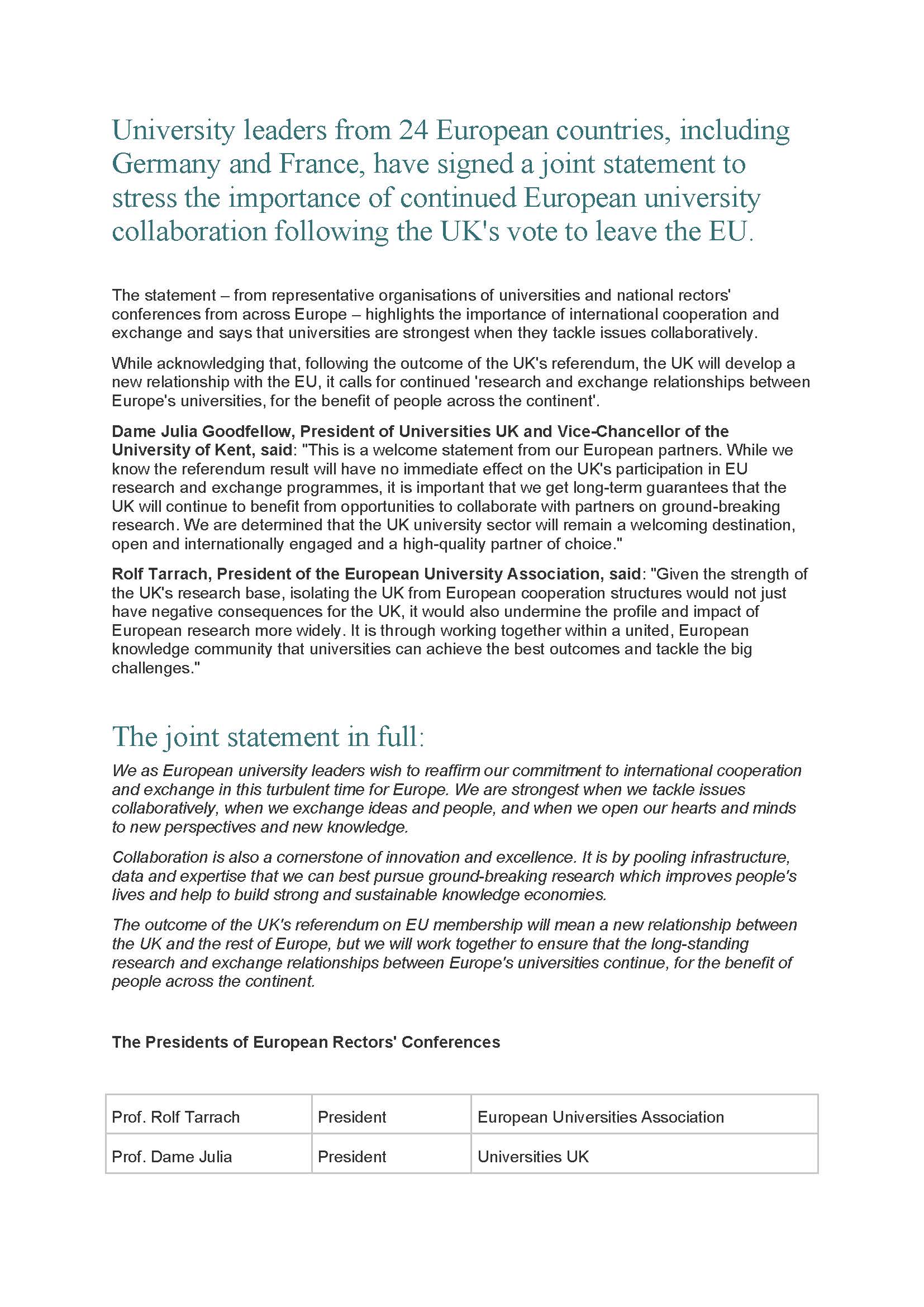 24 předsedů národních Konferencí rektorů, které jsou řádnými kolektivními členy Evropské univerzitní asociace (EUA), podepsalo společné prohlášení, kterým je kladen důraz na důležitost pokračování evropské univerzitní spolupráce po hlasování Spojeného království Velké Británie a Severního Irska o vystoupení z Evropské unie. Jedním z prvních signatářů je i předseda České konference rektorů Prof. MUDr. Tomáš Zima, DrSc., MBA, rektor Univerzity Karlovy v Praze.