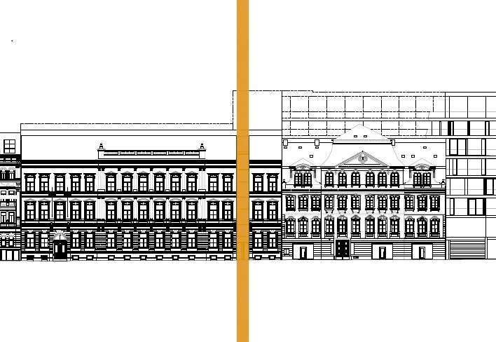 Potřebu vnější komunikace a otevřenosti zhmotňuje čelní fasáda stavby zvýrazněním a otevřením hlavního vstupu. Průřez do hloubky objektu předznamenává vnitřní funkci a život. Vynechání vstupního segmentu fasády přes celou výšku dokládá transformaci stavby ze školy základní na školu vysokou.